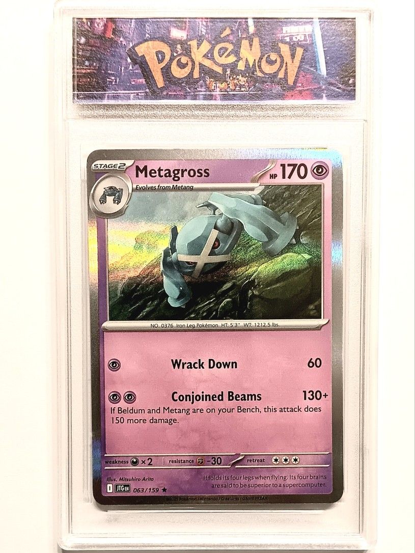 METAGROSS HOLO Scarlet & Violet: Journey Together 063/159 Rare Illustration by Mitsuhiro Arita Encapsulated (Non-Graded) ______________________________________________ Thank you for stopping by BANDOLERO COMICS on OfferUp ______________________________________________ ITEM: Ready to ship, please contact us before placing an order on items to ship. Local meet-up is available on weekends. Any and all questions regarding the items for sale will be answered promptly. IMAGES: Photos of front, back & sides of actual item for sale. Please inquire about any additional photos. GRADING: We do not guarantee a specific grade. Ask questions, and we will be more than happy to reply back to you. SHIPMENTS: Go out every week. Shipping will only be to the exact address listed on the OfferUp account. Please verify the address listed before ordering. Local meet-up is available on weekends. SHIPPING: Please contact us before placing an order on items to ship. A $6 shipping fee will be added for this item due to new policies on OfferUp. Bundle multiple items and save more on shipping. We will do our best to pack all items properly with lots of protection to prevent damage from incurring during shipment. We can not guarantee items will arrive undamaged once in possession of the USPS. RETURNS: All sales are final. Items purchased are "Buy As Is." Any "Damage" to items prior to shipment will be discussed before the final sale. No returns or exchanges will be accepted for items in the current condition. We will not accept your damaged or lower grade copy as a return. Photos of all items were taken in current pre-shipment condition. In the event an item is damaged during shipment, we are willing to refund or exchange for another copy if one is available.
