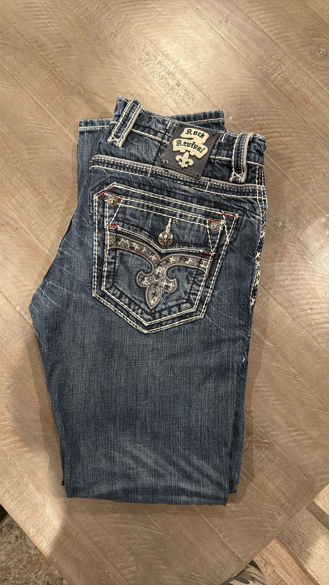 Rock Revival 34x34. Used but very good condition. See pics for slight wear at back of bottom hem.