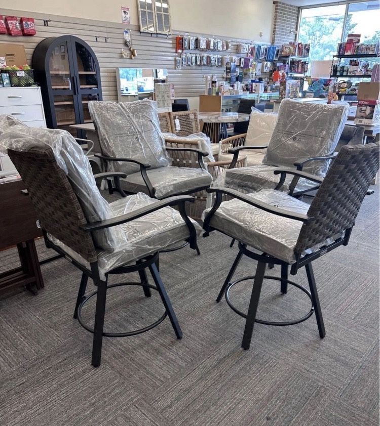 🌞🪑 4-Piece Outdoor High Swivel Dining Chairs Set – Brown | BRAND NEW & ASSEMBLED 🪑🌞 Upgrade your patio or backyard with this stylish and durable set of 4 high swivel dining chairs—perfect for outdoor entertaining and everyday comfort. ⭐ Key Features: ✅ Brand New & Fully Assembled – Ready to Use ✅ Set of 4 Swivel High Dining Chairs • Smooth swivel motion for easy movement and comfort 🛠️ Built for the Outdoors: • Powder-coated black steel frames resist rust, staining & peeling • Chair back sides feature handwoven, weather-resistant resin wicker • Designed to withstand all weather conditions 🪑 Comfort Included: • Gray cushions made with solution-dyed polyester • Filled with weather-resistant fiberfill for long-lasting comfort 📏 Dimensions & Specs: • Chair Size: 27.56” L × 23.94” W × 42.52” H • Weight per Chair: 28.9 lbs • Seating Capacity: Up to 4 people 🧼 Care: • Clean easily with a soft cloth and mild soap 🧱 Materials: • Steel frame • Polyester cushions • Resin wicker accents 🎨 Color: Brown chairs with gray cushions 📦 Condition: Brand New / Assembled Perfect for patios, decks, gardens, or poolside dining—stylish, comfortable, and built to last. 💬 Message me for price, pickup, or availability!