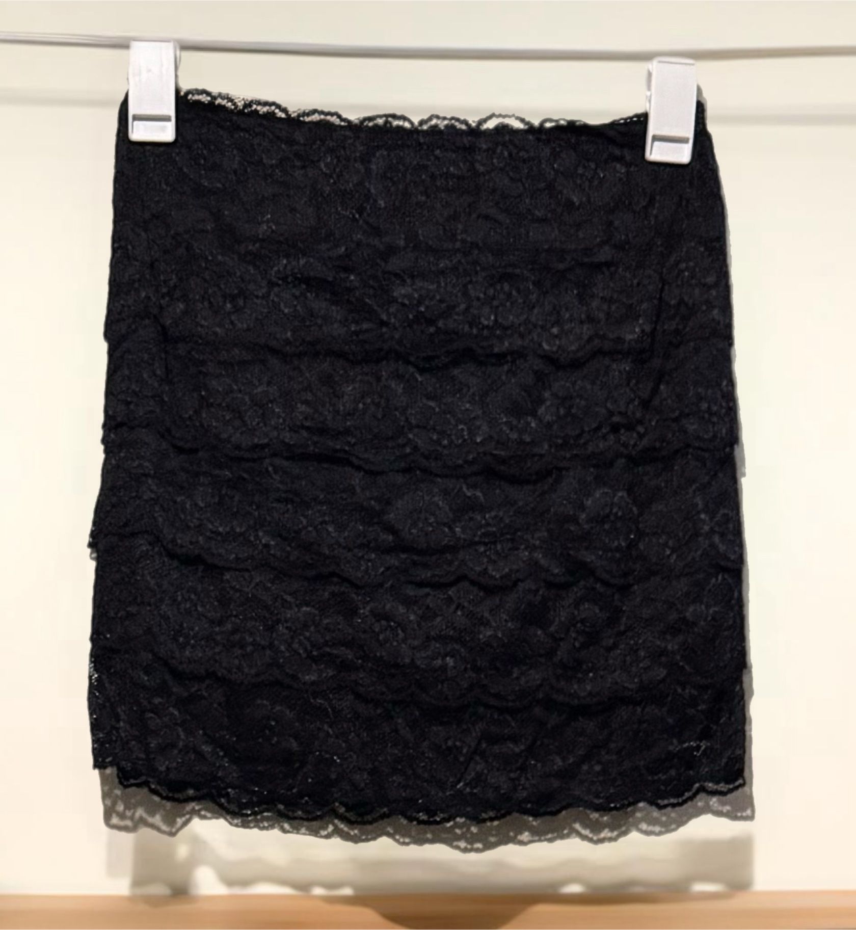 ~EUC, size M, 16” length ~women’s black tiered lace mini skirt, pencil design, lined, elastic waist, pull on ~machine wash cold/hang dry ~smoke free/dog friendly home ~POOS FCFS ~shipping/bundling, pickup or meet locally, or invoice with Venmo ~$15 or best offer