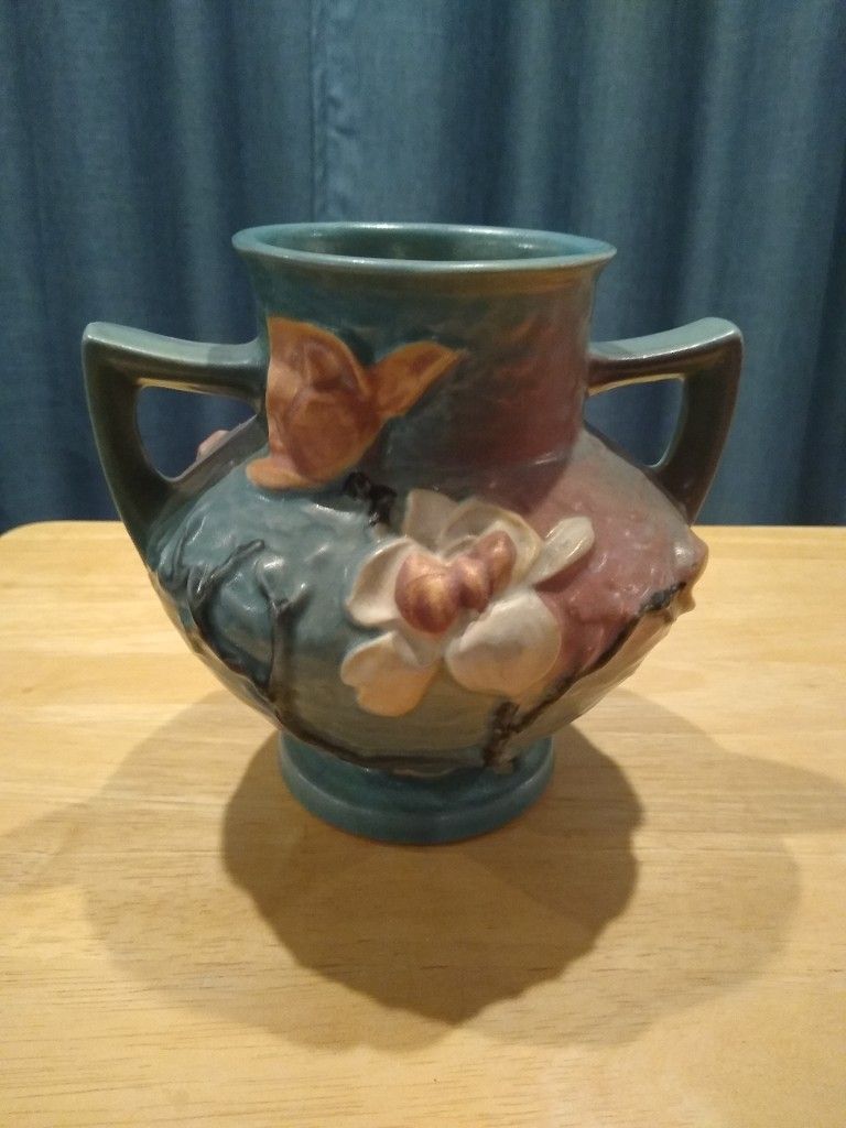 Hand painted Roseville sgraffito pottery vase with Magnolia raised motif from 1943. Each year from 1890 to 1954 a different flower was featured. Roseville marking is on bottom of vase. No chips or scratches. Has been used as vase so there is a water marking inside. 6" tall, 7" wide at handles, 4" opening.