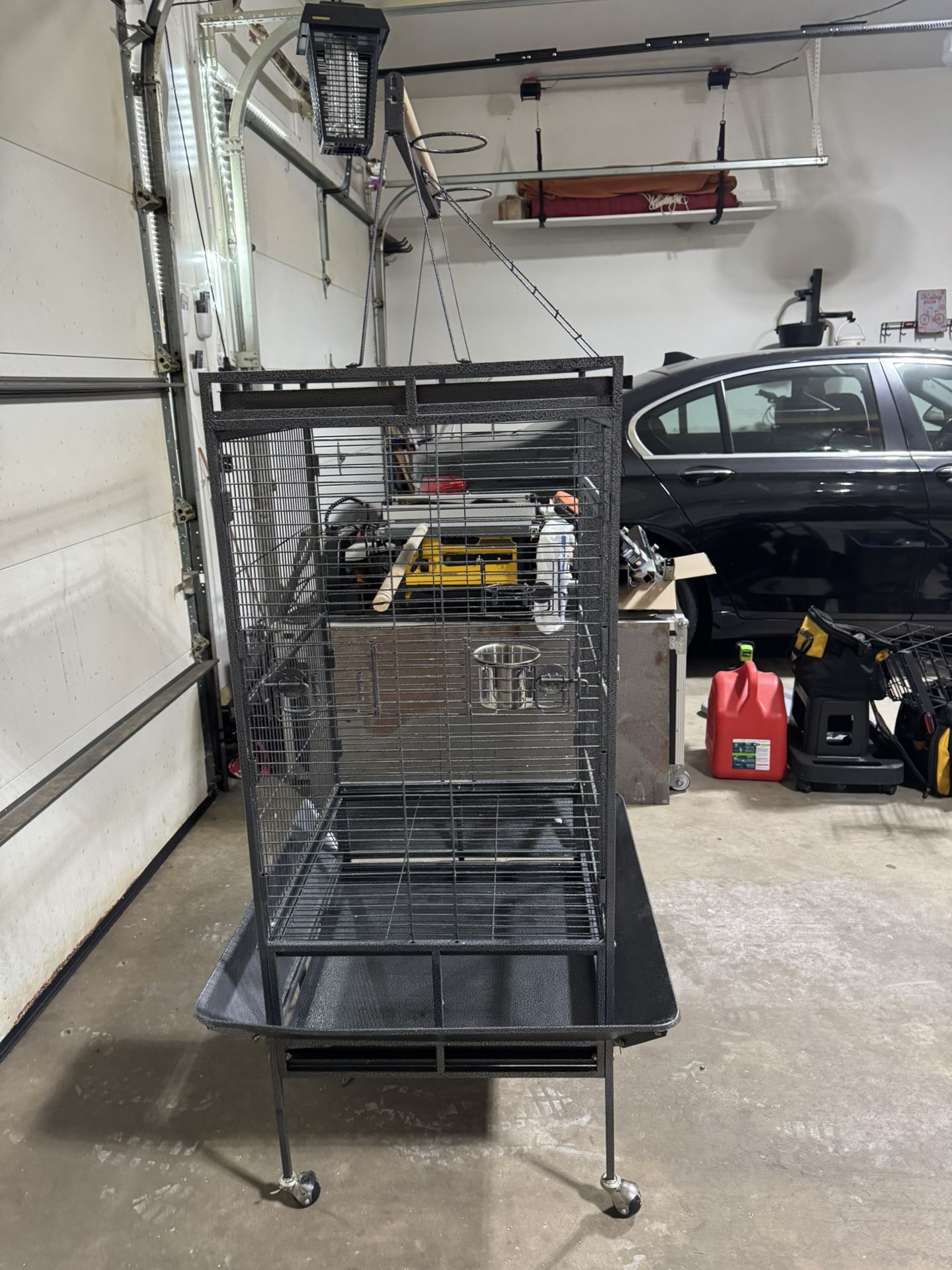 Please check pics. Local pickup only. Hi, the actual space where the bird sits inside not including the over height is: 1. Width around is 24” x 24” 2. Height is 32” all around. The over all height of the cage is 68” The bottom and top trays are removable for cleaning. It has a main door and two side feeding doors. This is an excellent cage for cocktails, small birds and small parrots.
