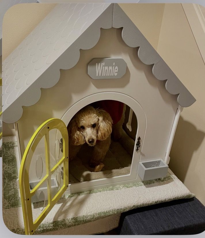 Dog house with latching door. Super cute! We have two “houses” but our pup chose one, so this one is barely used. It’s 30” tall, 30” wide, 24” long. It has an open bottom to put their favorite dog bed, cushion, pillow, or blankets inside. Paint your pups name on the front or remove name plate. It even has little flower boxes on the front…or use as a treat cup. Ready for pick up. Cash only. I bought this on Etsy a while back and paid a lot. (Receipt info in pictures🫣). It’s yours for $100.