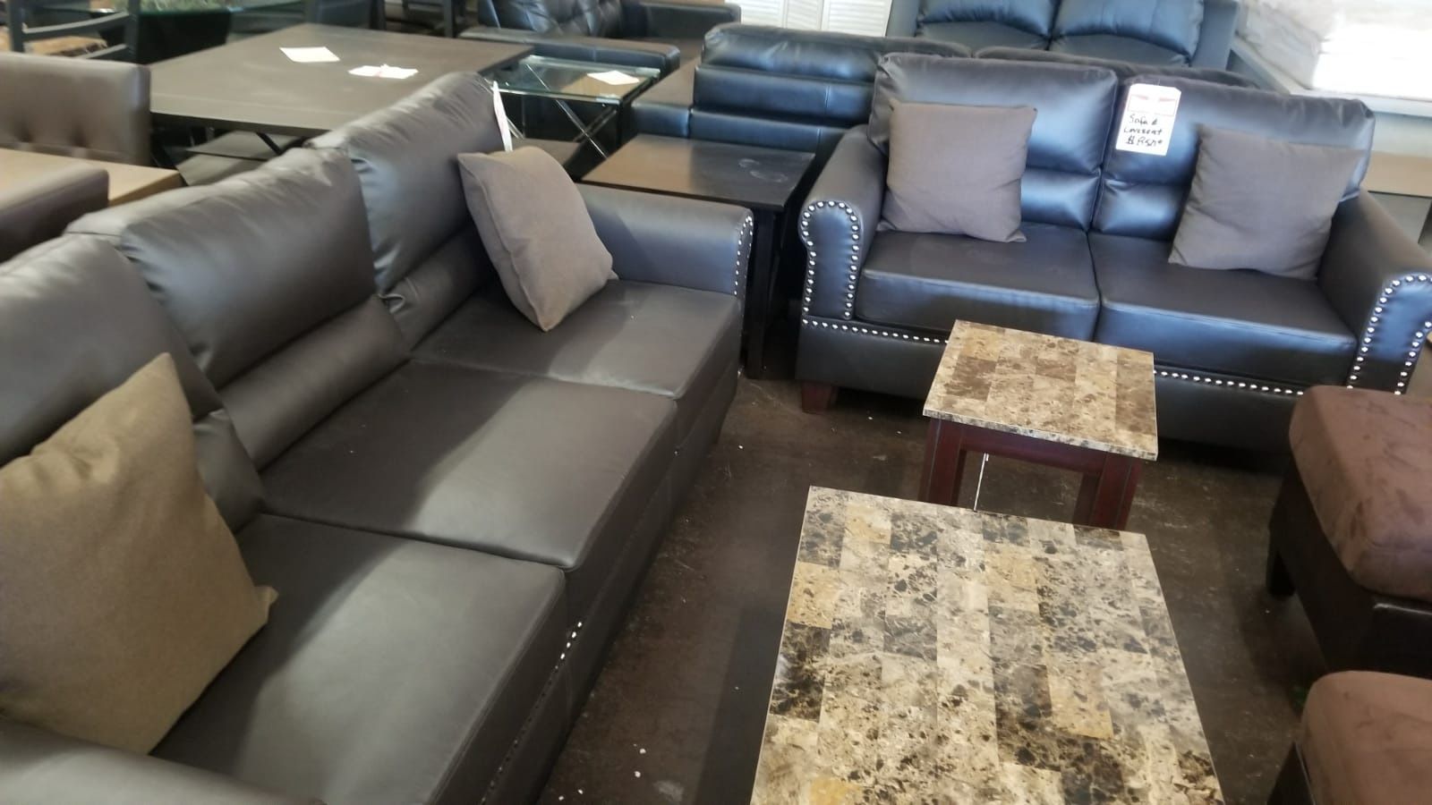 Dark brown traditional pinhead faux leather sofa and loveseat