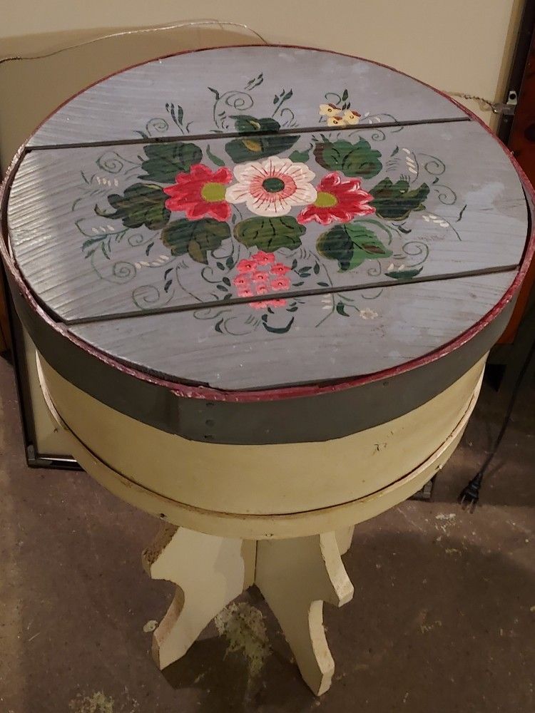 Not just a light cheese box, pantry box is quite heavy. Nicely painted homemade base unique piece. Had sewing items in it good storage table About 27 1/2" tall, 17" diameter pantry box 6" deep inside