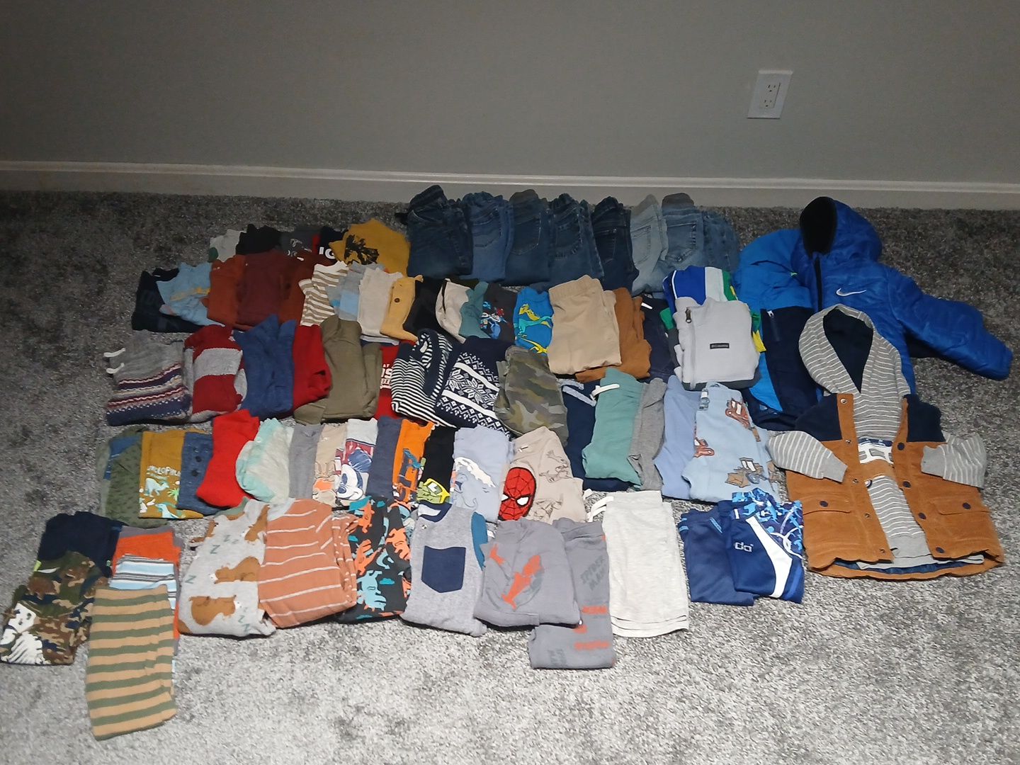 Boy's lot of 3t clothing Good condition T-shirts, long sleeve, jeans, sweatpants, pajamas/footie pajamas, 1 pair shorts, 2 swim shirts, windbreaker, Columbia fleece, 2 winter jackets (1 Nike), and vest and sweatshirt set.