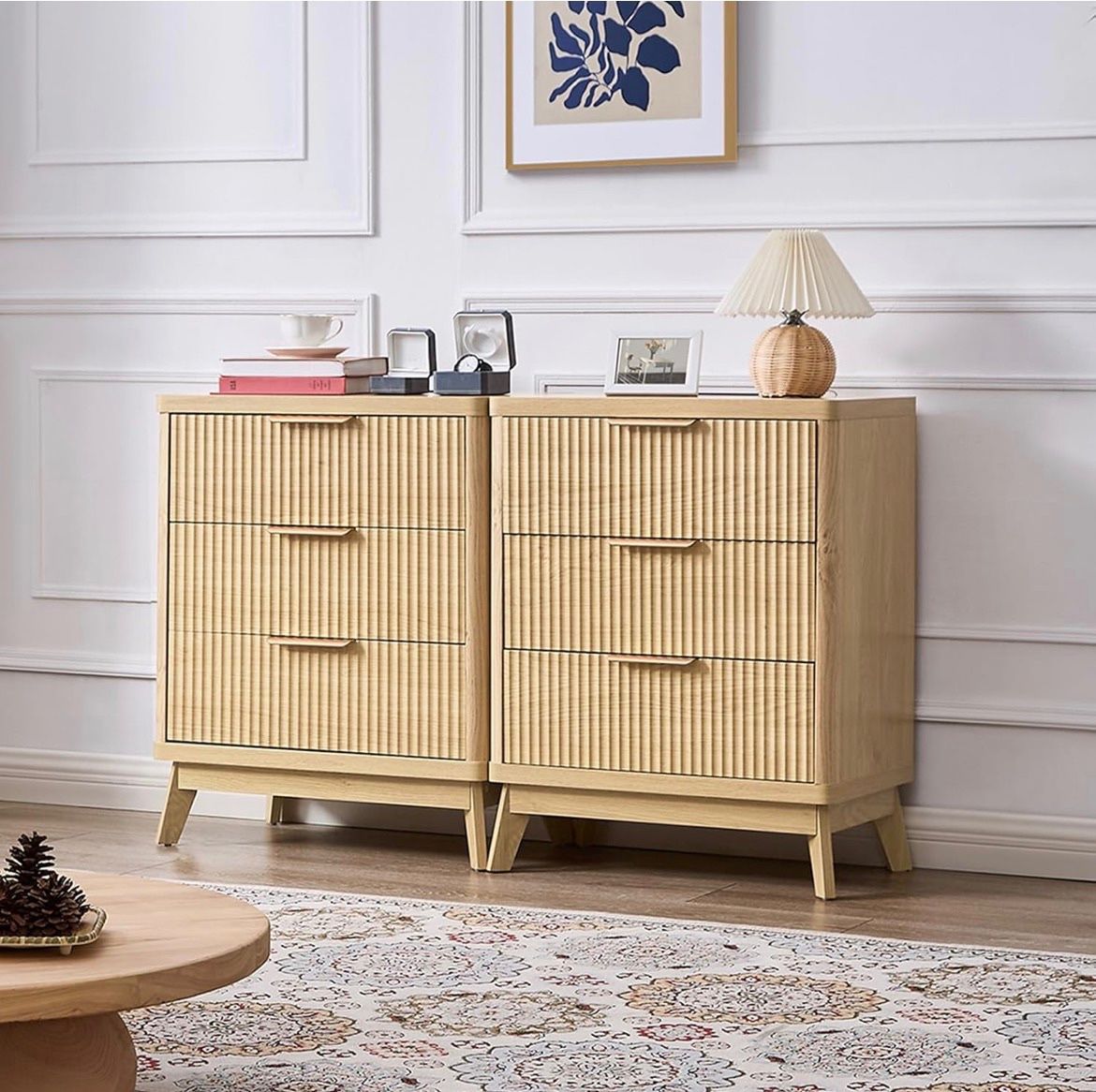 Set Of 2, 3 Drawer Dressers, Fluted Drawers & Golden Handles With Charging Outlet Stations