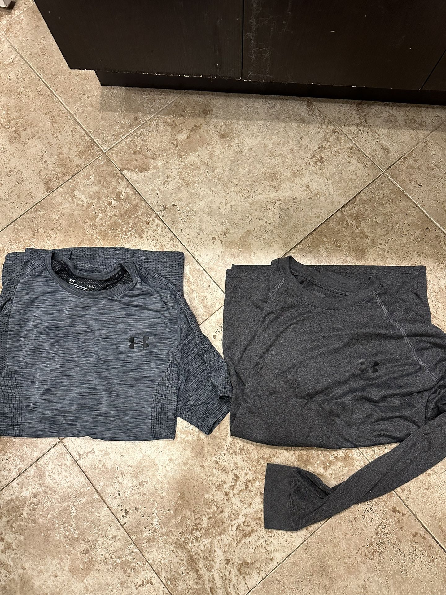 2 under armour men’s shirts one short sleeve and 1 long both size L