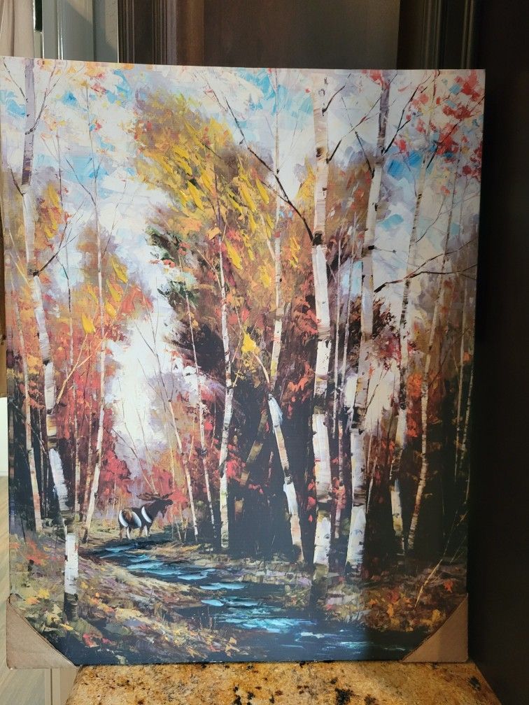 Beautiful forest scene with vibrant autumn colors and blue water creek and blue sky. Measures 28 1/2 H x 22" W. Can be hung as is or framed. Never used. Please see my other items for sale. Thank you.