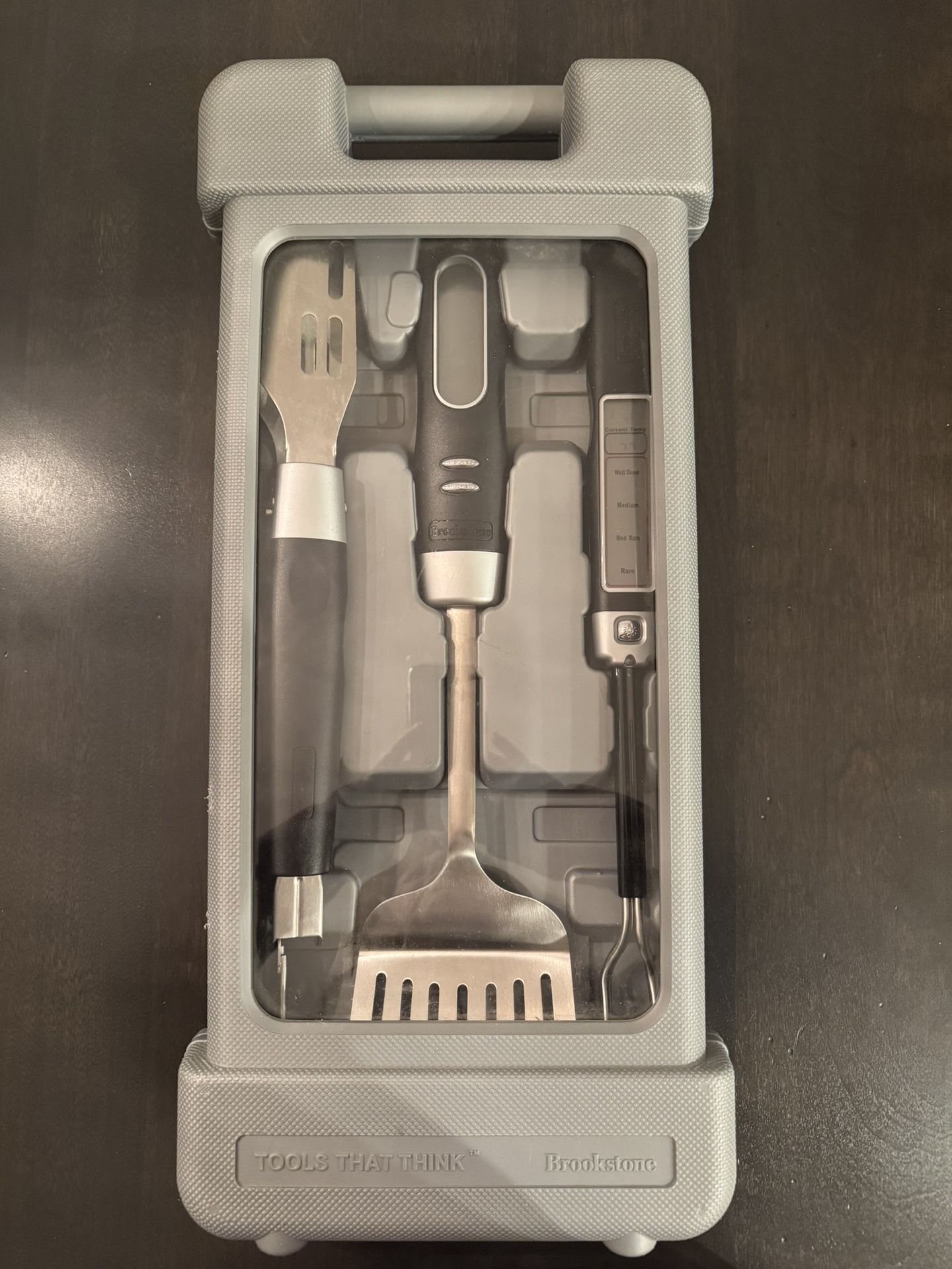 Brookstone BBQ grill set received as a gift but never used. Set includes smart tools with temperature sensor spatula which works, tongs, and meat thermometer which isn’t working. New batteries included.
