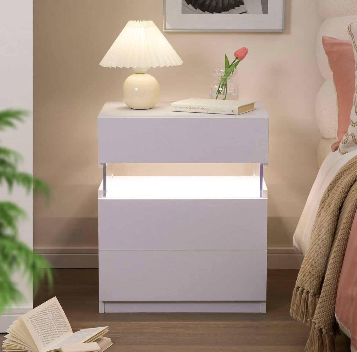 White LED Nightstand Modern Night Stand for Bedroom Bedside Table with 3 Wood Drawers End Side Table