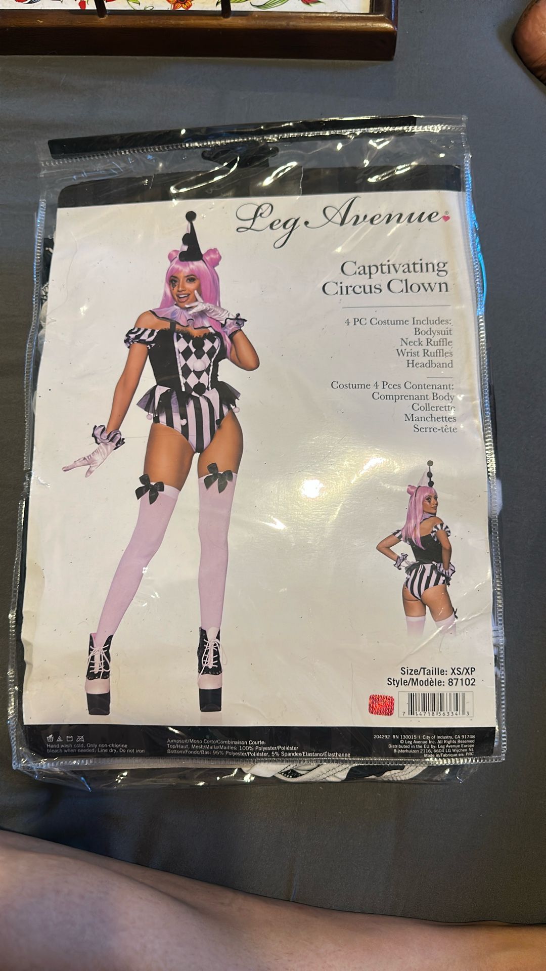 Captivating circus clown costume. Four piece includes bodysuit, neck, ruffles, wrist, ruffles, and headband.