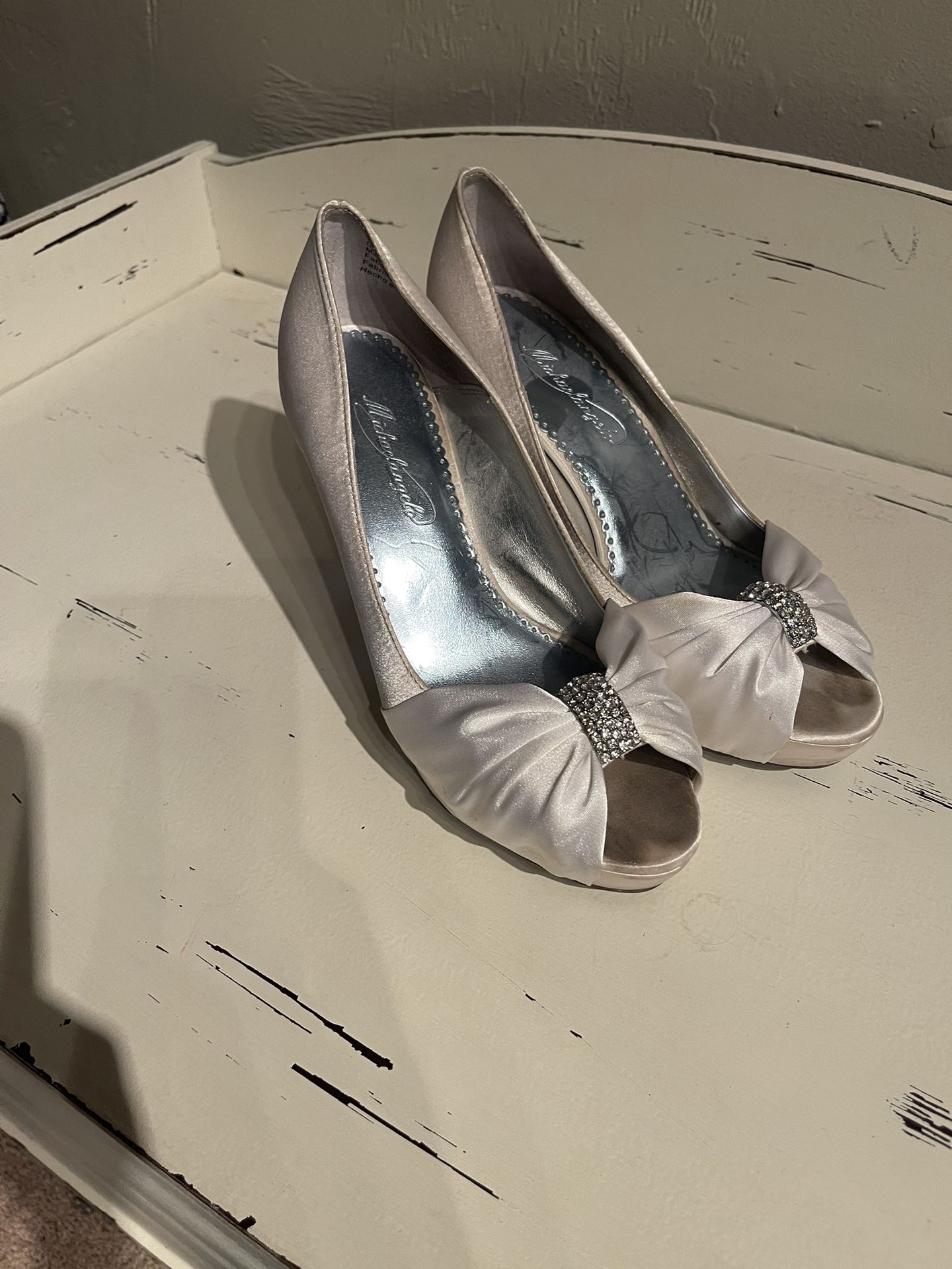 White Satin Open Toe Wedding Heels with Rhinestones