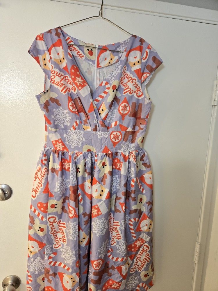 Size large, lavender Christmas print dress. Perfect for teachers with a really cute pattern. Reaches to about the knee. Purchased on Amazon for $30 and worn once.