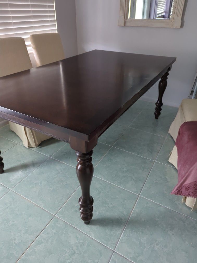 Very sturdy seldom used. 72x42. Large extension leaf 18" wide to add for holiday dinner parties. Wayfair, farmhouse dark wood Must sacrifice for smaller condo limited space. $195.00