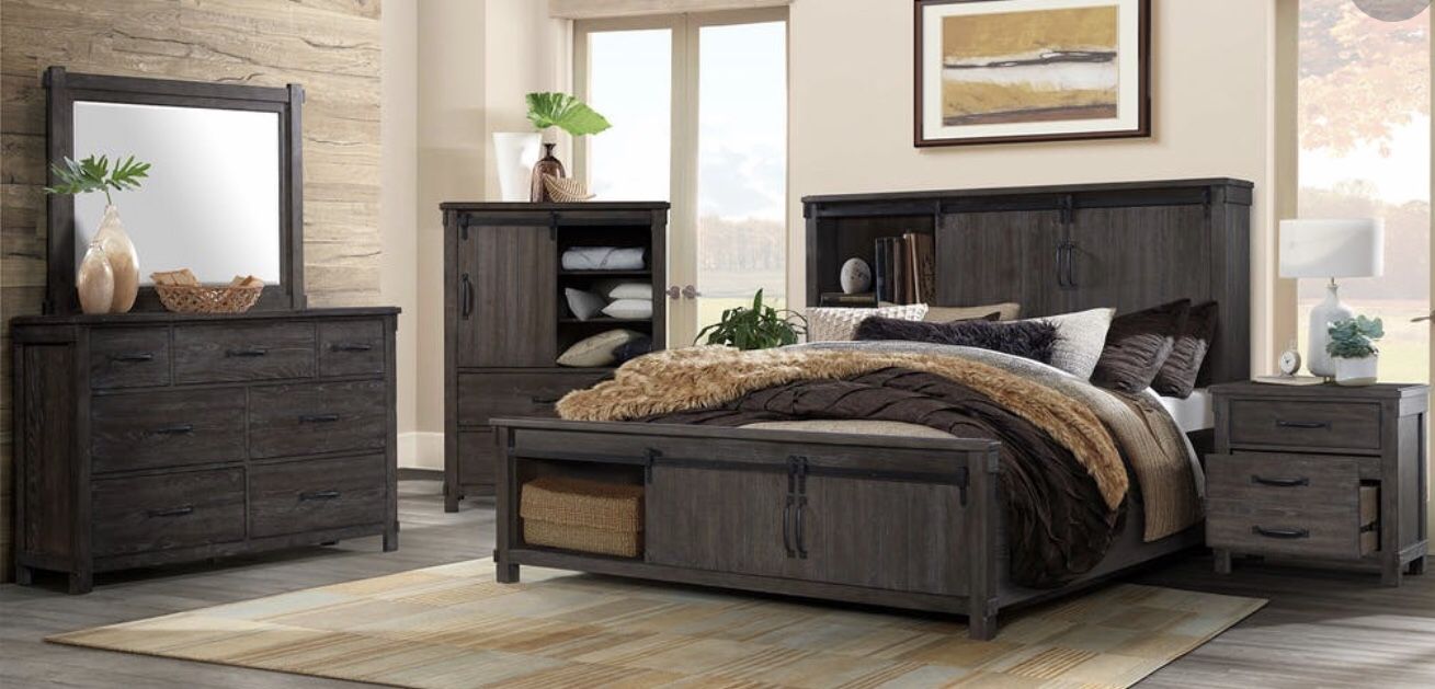 ****NEW ADDITION**** Brand New Queen Bedroom Set Only $1399 Set Includes Queen Bed, Nightstand, Dresser & Mirror (Mattress & Chest Sold Separately) Also Available in King Size Also Available in White Barn Wood Finish Storage Bed Sliding Barn Doors Dark Metal Hardware Ball Bearing Drawer Guides Perfect for introducing a farmhouse look to your bedroom while adding additional storage space. Hablamos Español **Come Visit Our Showroom** All Floor Model’s Up To 50% Off!!! INCREASE YOUR PURCHASING POWER!!! Easy Approval Credit Check Program w/ 6, 12, 18 & 24 Months Financing SAME AS CASH IF PAID OFF IN 90 DAYS!!! No Credit Check Financing Also Available. Come See Us @ Zoe’s Furniture in Richardson, Texas Only!!! EL. Three Seven Zero. Eight Thirty. CS