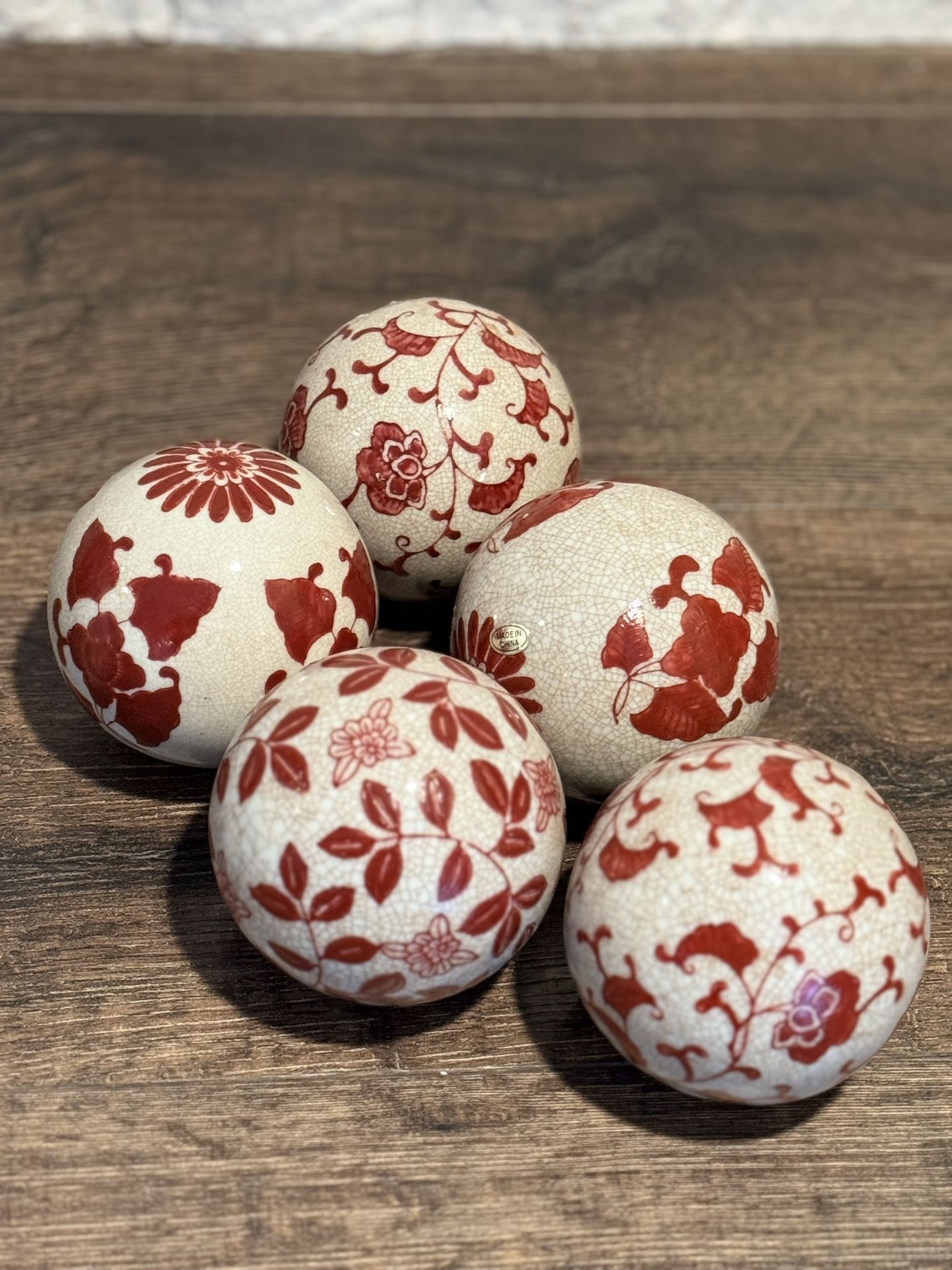 Add a touch of timeless elegance to your home with this beautiful set of five (5) vintage porcelain decorative spheres. These "carpet balls" feature a classic Chinoiserie aesthetic with vibrant red floral transferware patterns against a creamy, crackle-glaze white background. They are the perfect weight and size for a tabletop bowl display, a bookshelf accent, or a centerpiece. Product Features: • Quantity: Complete set of 5 unique spheres. • Design: Assorted traditional botanical motifs, including chrysanthemums and scrolling vines. • Finish: High-gloss glaze with a beautiful crazing (crackle) effect that gives them an authentic vintage feel. • Colorway: Deep "Cinnabar" or "Oxblood" red on off-white porcelain. • Provenance: One sphere retains its original "Made in China" export sticker. -Has small area of surface residue/discoloration (pictured in close-ups). This is common for vintage display pieces and does not detract from the beauty of the set when displayed. Check out our other listings for great things with great prices!