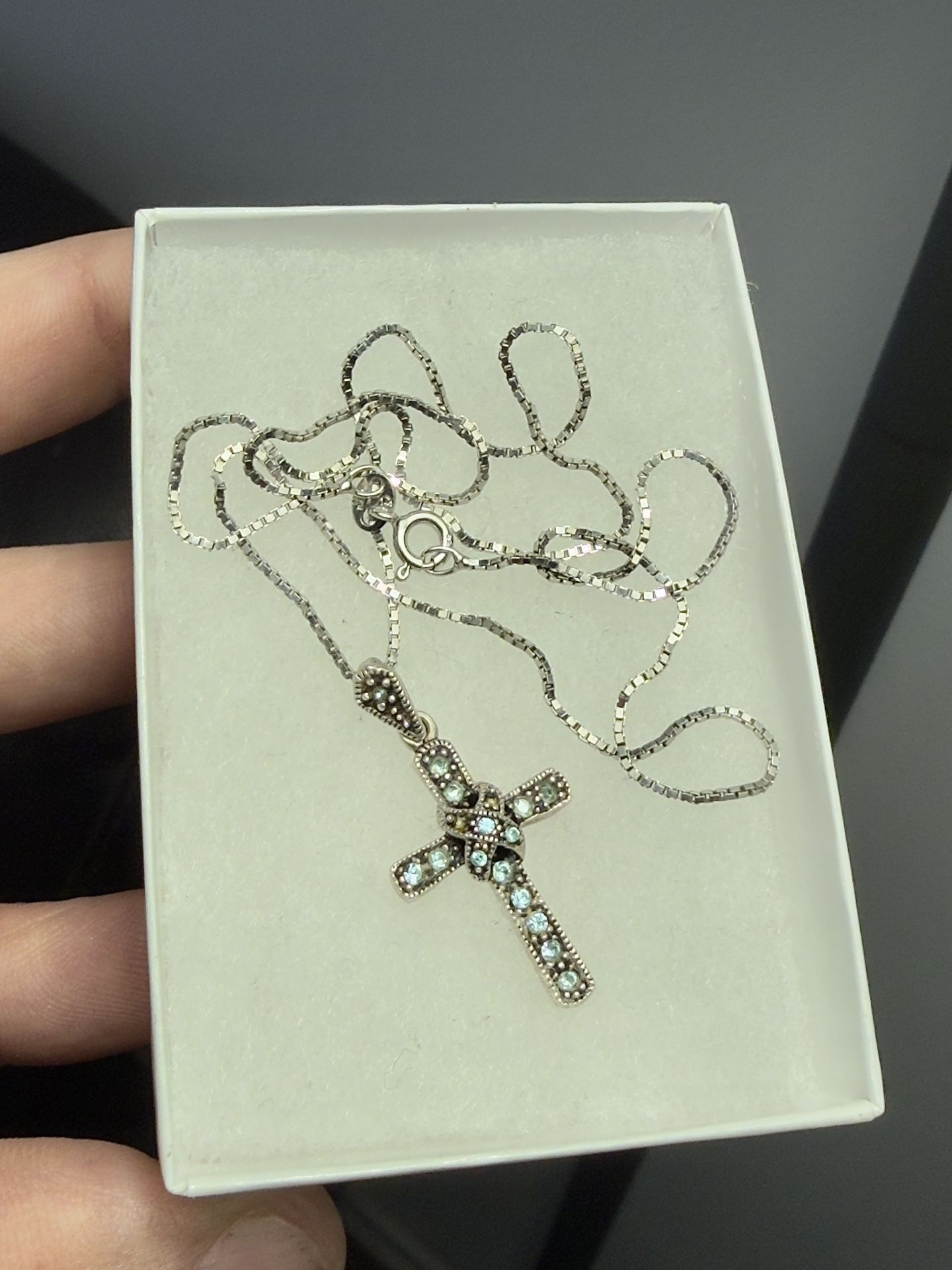 - beautiful, aquamarine, sterling silver necklace ! - very high-quality / solid and crafted with detail ! - features a vintage cross on a beautiful silver box chain ! -makes for an amazing gift! - Chain is 18 inches long ! - definitely a necklace to cherish and priced at a great price !