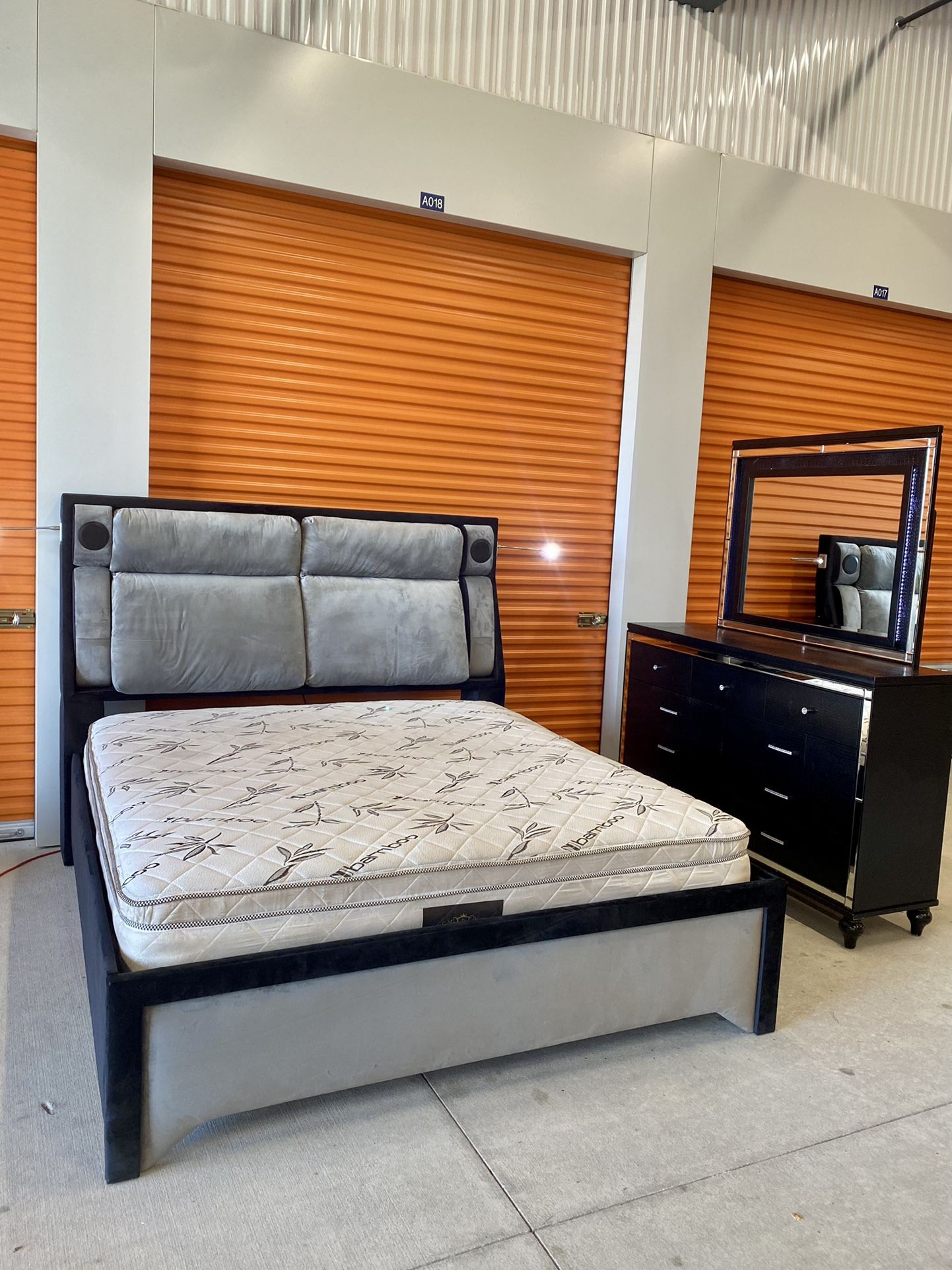 King sized bedroom set with gray and black suede like bed that has built in bluetooth speakers, reading lights, usb plugs, and cup holders. Not to mention the headrest is actually soft enough for you to lean back on and relax. There is also an XL 9 drawer textured dresser with dimmable lights. King mattress and bunkie boards included. *dresser measures: 67”L X 18”W X 42 1/2”H. *set is the same price even if you don’t want the mattress. *Bed is large and the dresser is large and heavy. Pls don’t inquire about coming to see if not interested in purchasing.
