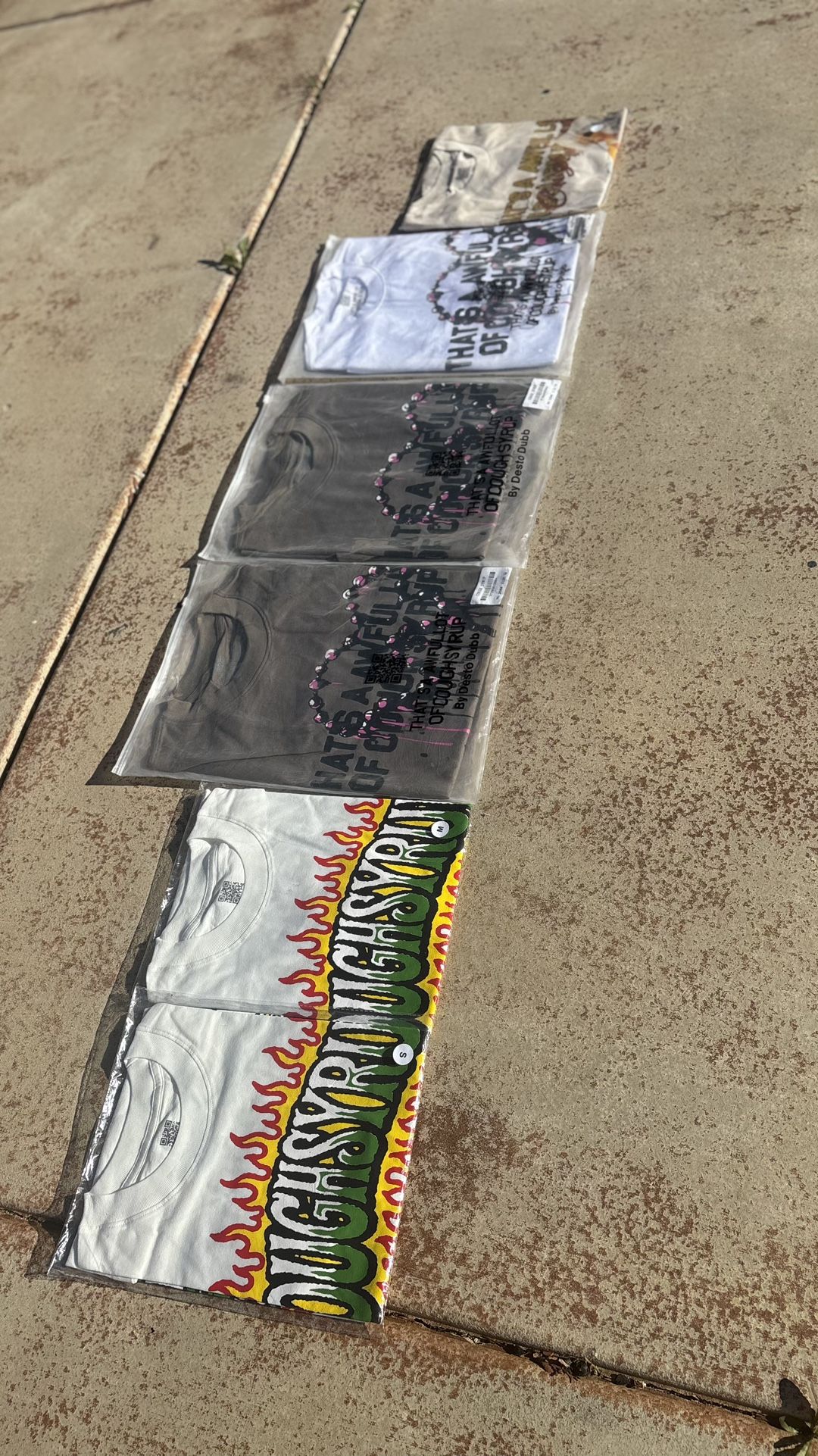 Deadstock Alocs tees Rosary tee (white) Sz M x1 Rosary tee (grey) Sz M x2 Caesar Chavez Alameda Tee (white) Sz S & M Cream lasso tee (cream) Sz L