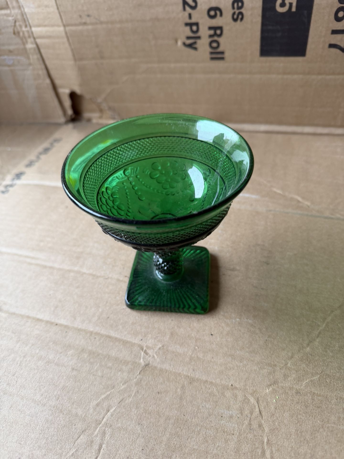 Vintage green pressed glass set. Includes 1 decorative bowl on pedestal and 1 goblet / glass on clear stem. • Mid-century style • Beautiful emerald green color • Solid heavy glass • No cracks or chips • Perfect for décor, bar display, or collection Selling as a set. Local pickup.