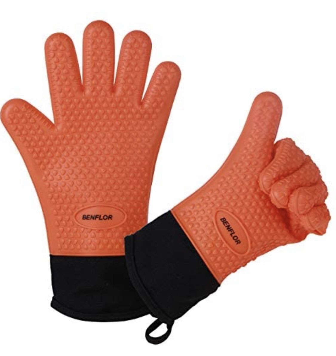 MATERIAL - These oven and grill gloves are made of 100% food grade silicone, BPA-free, non-toxic, odor-resistant. Double layer soft cotton lining provides superior comfort and protection, and keeps your hands stay cool and fresh. HEAT RESISTANT GLOVES - These BBQ grill gloves are fire resistant, withstanding temp up to 464ºF, perfectly protecting your hands while tending to BBQ, smoker and other household tasks, making them an essential cooking accessory in your kitchen or camping accessory while travelling. EXTRA CUFF LENGTH & ANTI-SLIP - 3.1 inches extra double layer sleeve keeps your wrist and arm away from heat, oil, BBQ sauce and sharp edge while grilling, cooking, baking or handling hot items in the kitchen or outdoors. No need to worry about falling with the non-slip design when picking up food. EASY TO CLAEAN - These pit gloves are resistant to heat, grease, oil, water, stains and even chemical liquid, which makes them easy to clean. Simple rinse the gloves under water tap and hang them to dry on a hook with the attached loop on the cuff for easy storage. Dishwasher safe.
