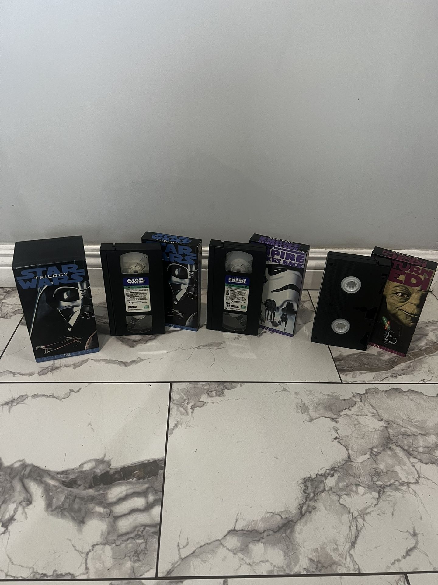 Original vintage StarWars Trilogy VHS Set.includes box and three VHS Star Wars a new Hope, the Empire strikes back, and the return of the Jedi Never used in perfect condition!