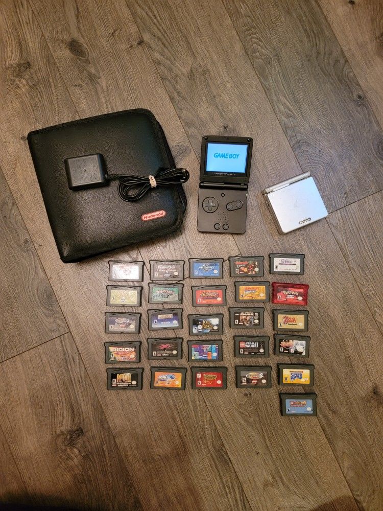Game Boy Advance SP lot! Perfect collection for retro gaming enthusiasts or a great way to start one. - Game Boy Advance SP (Black): In good, tested, and working condition. Comes with a charger. - Game Boy Advance SP (Silver): For repair. The charging port needs attention (estimated $10 cost to fix). - 26 Game Boy Advance Games: All cartridges are tested and working. Includes high-value, titles such as Pokémon Ruby Version and Castlevania: Aria of Sorrow. See the full list of games below. - Nintendo Game Boy Game Case: Holds 32 games, zips, good condition. Game List: - Pokémon Ruby Version (Value: approx. $95+) - Castlevania Aria of Sorrow (Value: approx. $59+) - Metroid Fusion (Value: approx. $47+) - Final Fantasy V Advance (Value: approx. $68+ loose for FFVI, V likely similar) - Wario Land 4 (Value: approx. $30+) - Donkey Kong Country 2 (Value: approx. $30+) - The Legend of Zelda A Link to the Past Four Swords (Value: approx. $25+) - Donkey Kong Country (Value: approx. $21+) - Super Mario Bros 3 Super Mario Advance 4 (Value: approx. $20+) - Yoshi's Island Super Mario Advance 3 (Value: approx. $15+) - Pitfall The Mayan Adventure - Star Wars - Tony Hawk's Pro Skater 2 - SSX Tricky - Mega Man Battle Network 4 Red Sun - Star Wars 2 The Original Trilogy - Pac Man Collection - Tetris Worlds - Iridion 3D - The Lord of the Rings The Two Towers - Mat Hoffman's Pro BMX - Frogger's Adventures Temple of the Frog - XXX - Harlem Globetrotters World Tour - Operation Armed Liberty - Caesars Palace Advance Millennium Gold Advance Pick up in Marysville area. Serious inquiries only. Cash only. OBO