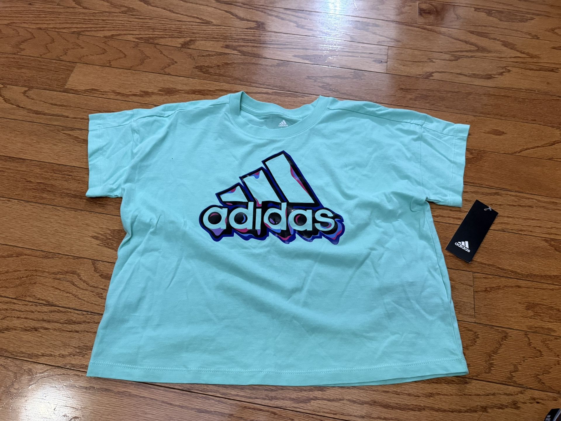 NWT Girls Adidas Boxy Tee - NWT, Adidas brand, light blue/teal color with black, purple & pink glossy design. Boxy/crop loose style, size medium 10/12.
