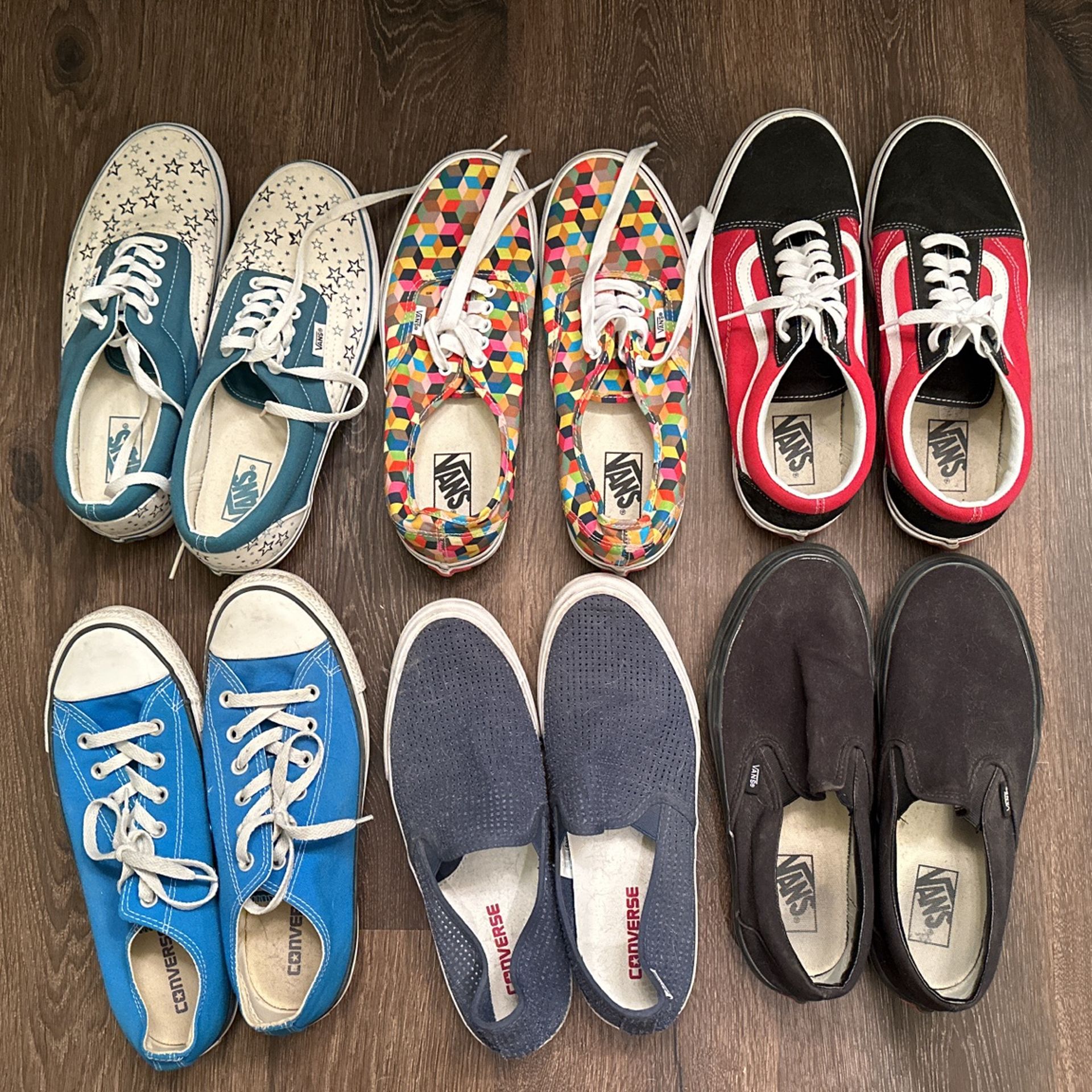 Gently used. Just dusty. 6 pairs $10 each or all 6 for $50. Porch Pickup near 75th Ave and Cactus. Top left to top right. Then bottom left to bottom right. Vans starts 9 men 10.5 women’s Vans Geometric 9 men 10.5 women’s Vans Black and red 9 men 10.5 women’s Converse blue 8 men’s 10 women’s Converse slip ons 9 men’s 10.5 women’s Vans black slip ons 9 men’s 10.5 women’s