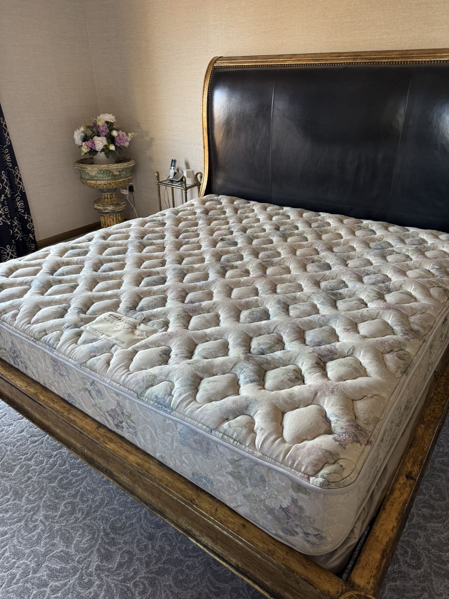 Beautiful Vintage Boho Century Gilt Wood and Leather King Bedframe. It was $5000 new.
