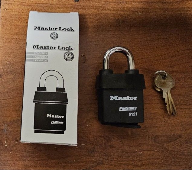 Pro series 6121ka A total of 15 - $30each Master Lock Pro Series 6121 padlock, designed for commercial and industrial applications. Key features include: Durable Construction: It has a 2-1/8 inch (54mm) wide heavy steel body to resist physical attacks. Weather Protection: A "Weather Tough" cover protects it from water, ice, dirt, and grime. Cut Resistance: The 5/16 inch (8mm) diameter hardened boron alloy shackle offers superior cut resistance. Rekeyable Cylinder: It features a rekeyable 5-pin cylinder for added security and allows changing the key without replacing the entire lock. Dual Locking: A dual ball locking mechanism resists pulling and prying. Keyed alike Keys: It includes two keys per padlock.