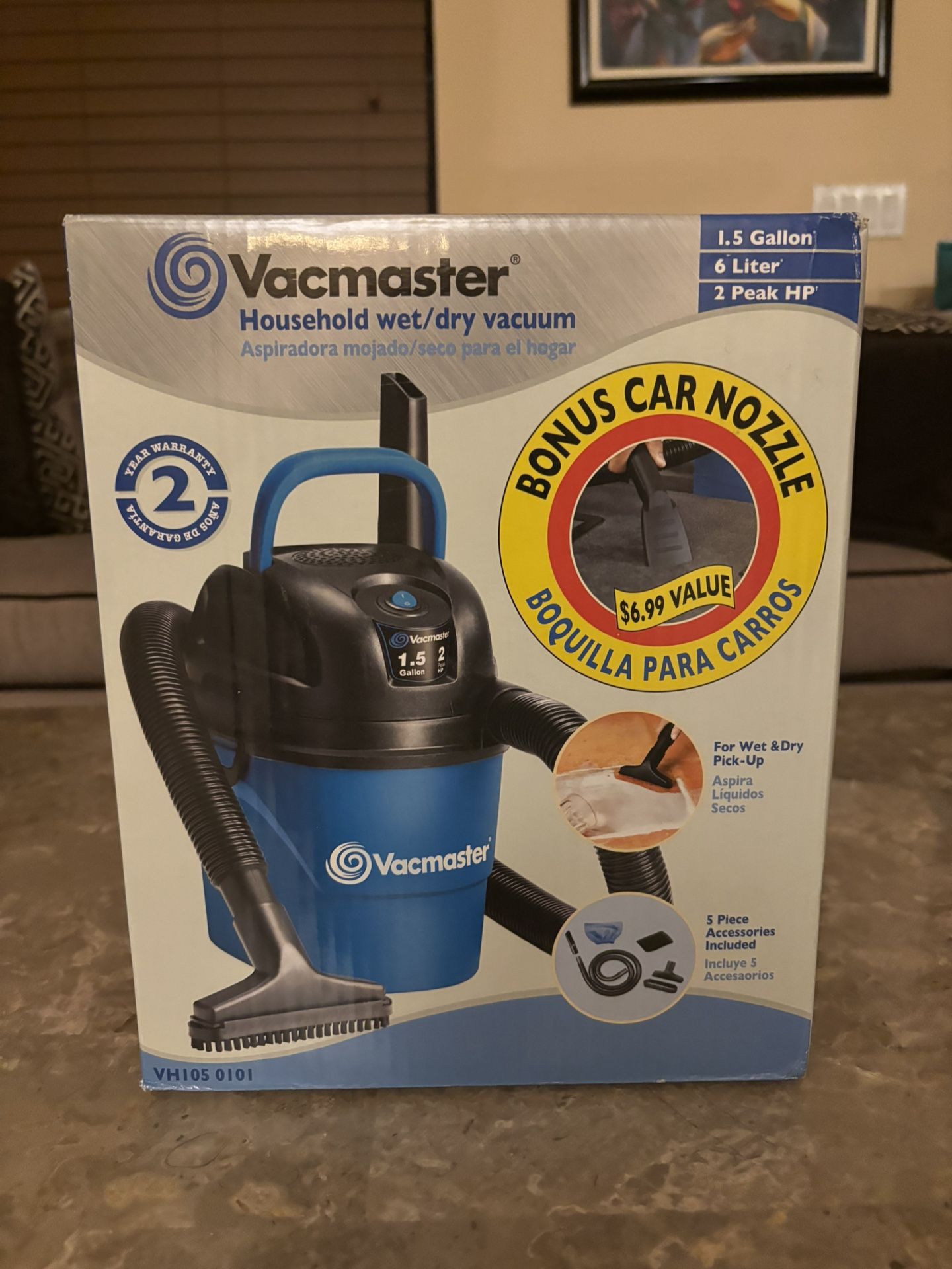Lightweight, powerful and portable, this versatile Vacmaster 1.5 Gallon Wet/Dry Vac is a convenient size for quick cleanups and stores easily. This multi-surface vacuum can clean up both wet and dry messes on all kinds of surfaces. It weighs less than 6 Ibs., has a 5.5-inch cleaning path and comes with a crevice tool for getting hard-to-reach places completely clean. It comes with a 4-foot by 1.25-in diameter hose, reusable cloth filter, reusable foam wet filter, 2-in-1 utility nozzle, crevice tool, and on-board accessory storage to keep your Vacmaster 1.5 Gallon Wet/Dry Vac organized when it's not in use. Tank Size refers to the actual tank volume, and does not reflect capacity available during operation. Peak Horsepower is a term used in the wet-dry vac industry for consumer comparison purposes. It does not denote the operational horsepower output of a wet-dry vac, but rather the horsepower output of a motor, including the motor's inertial contribution, achieved in laboratory testing. In actual use, motors do not operate at the peak horsepower shown. CFM, Water Lift, and Air Watts tested to ASTM standard at the end of included hose.