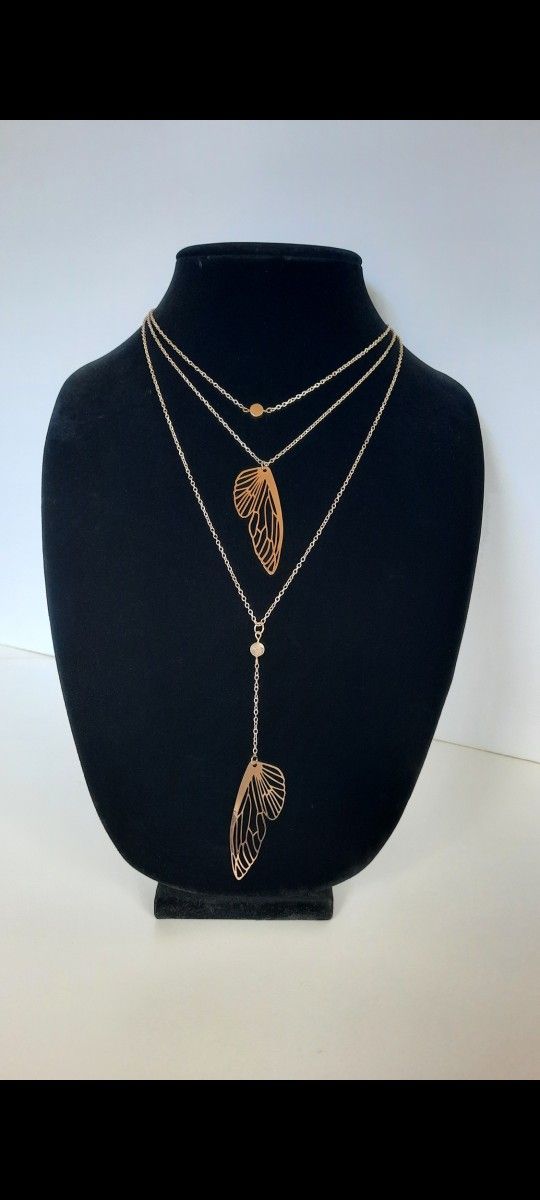 Elegant warm gold, wing pendant necklace. This multi length fashion jewelry is 16" around the smallest chain with 3" adjustable chain. Handmade to order.