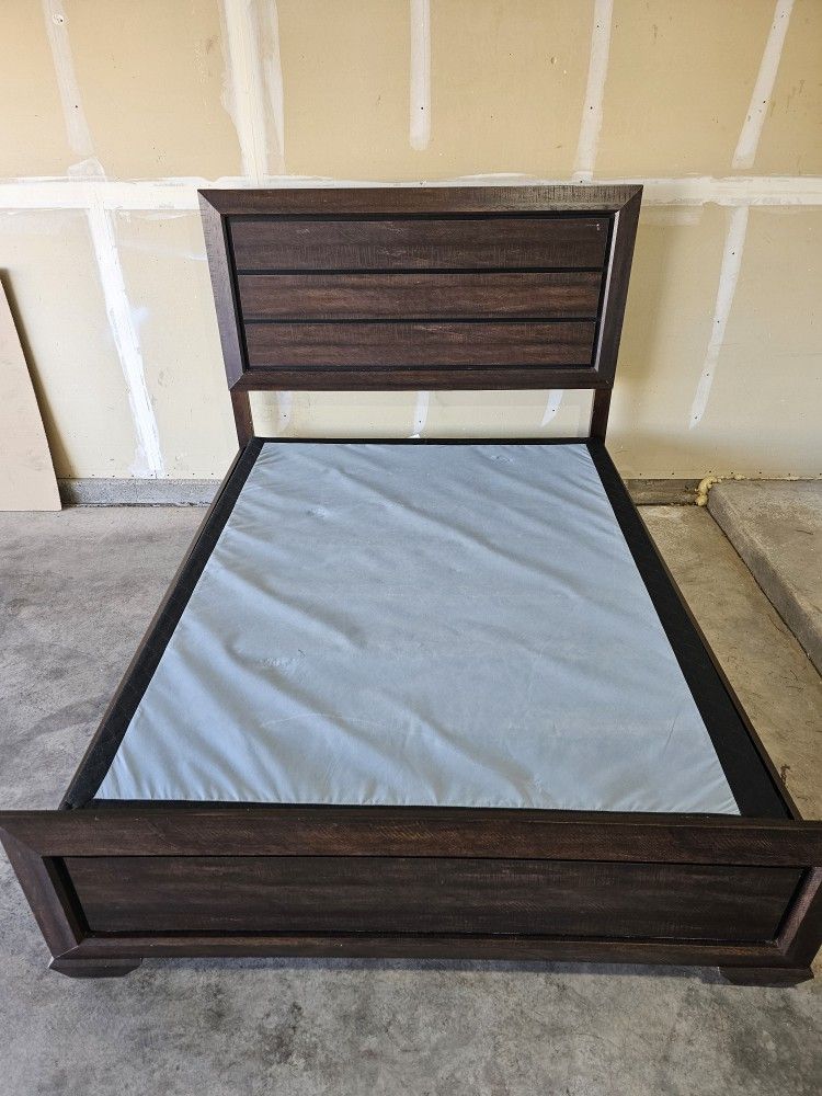 Great condition dark brown queen bedframe & low profile boxspring fairly new.