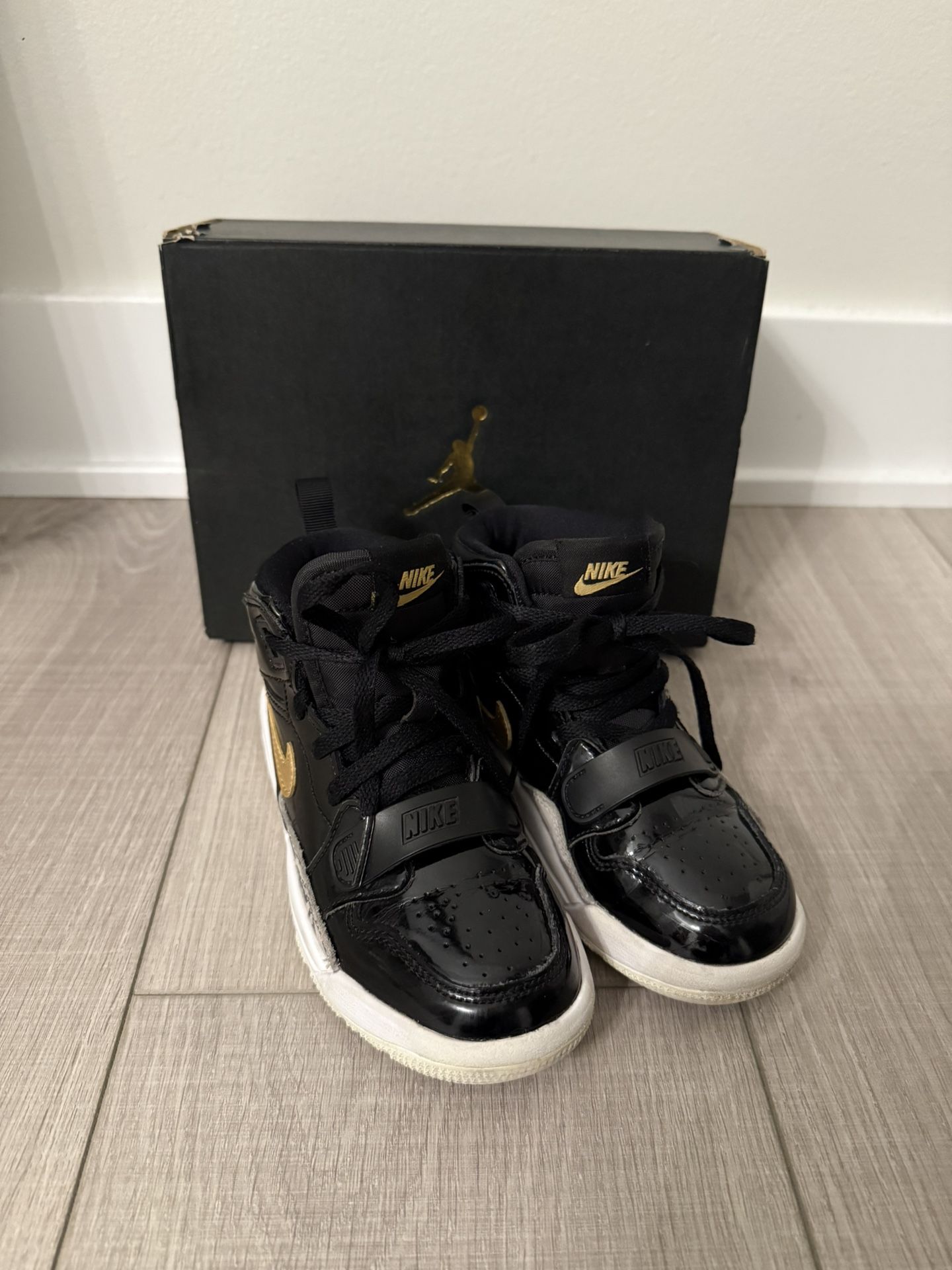 Nike Jordan Legacy toddler sneakers in very good condition. Gently worn and cleaned. Black patent with metallic gold details. Size US 11C or EUR 28