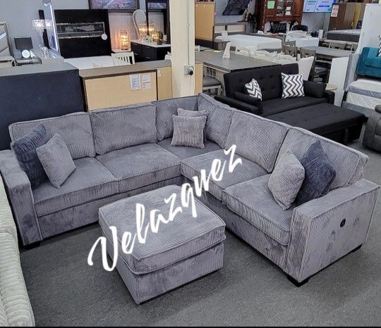 ✅️✅️4 pc dark grey corduroy fabric upholstered sectional sofa with USB plugs and ottoman. This set includes the LAF / RAF love seat, corner wedge and ottoman. Sectional measures 99" x 99" x 34" x 35" H. ✅️✅️$454 + sale tax $499 total cash only ✅️ this promotion is just pick up only Delivery is not available ✅️✅️