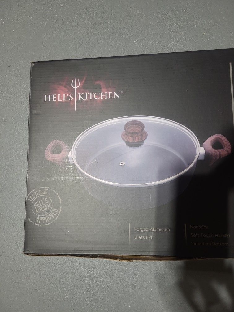 Forged aluminum. Non stick surface. Glass vented lid and beautiful wood handles. New