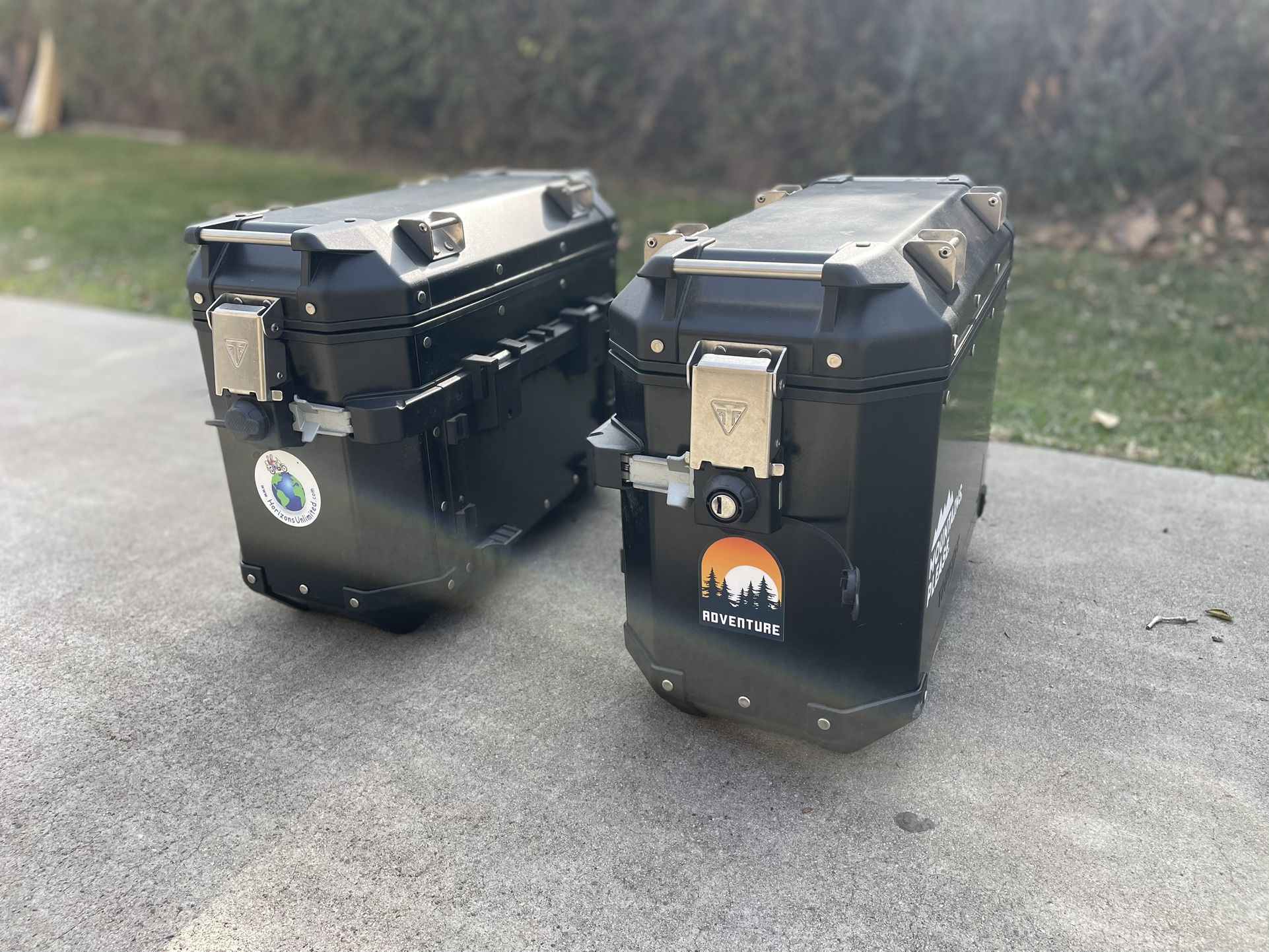 Panniers (Left & Right) for Triumph Tiger Explorer 1200 / Tiger 800 Lightly used. Replaced mine with soft panniers and no longer needed. Right Pannier - 38 Liters Left Pannier - 41 Liters High-Impact Trim covers protect the edges and corners of the luggage Approximately 39.25" total width when mounted. Panniers made from 2mm aluminum with stainless steel rivet construction