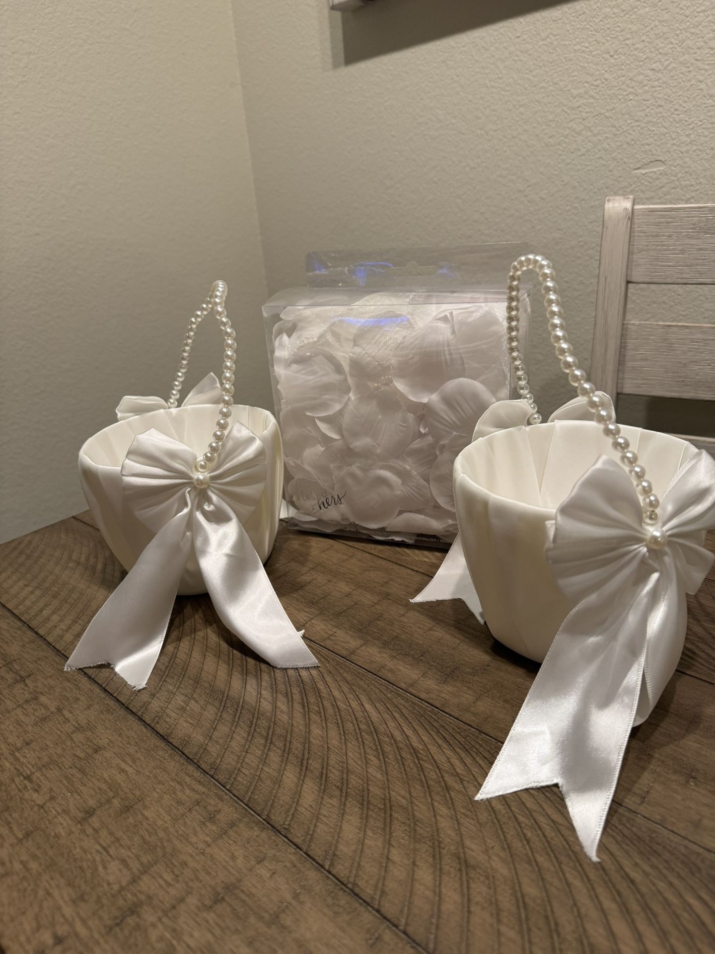 2 Flower girl baskets with brand new petal box- $15 Heart cake topper brand new- $2 Table sign holders brand new - $5 Place card holders brand new - $3 Hashtag sign- $10 Sparkler signs with pen- $4 4 reserved signs- $10 3 bridesmaid bouquets- $45 Bride bouquet- $40 Bride robe- $5 (one size fits all) Decorative Metal tub- $10