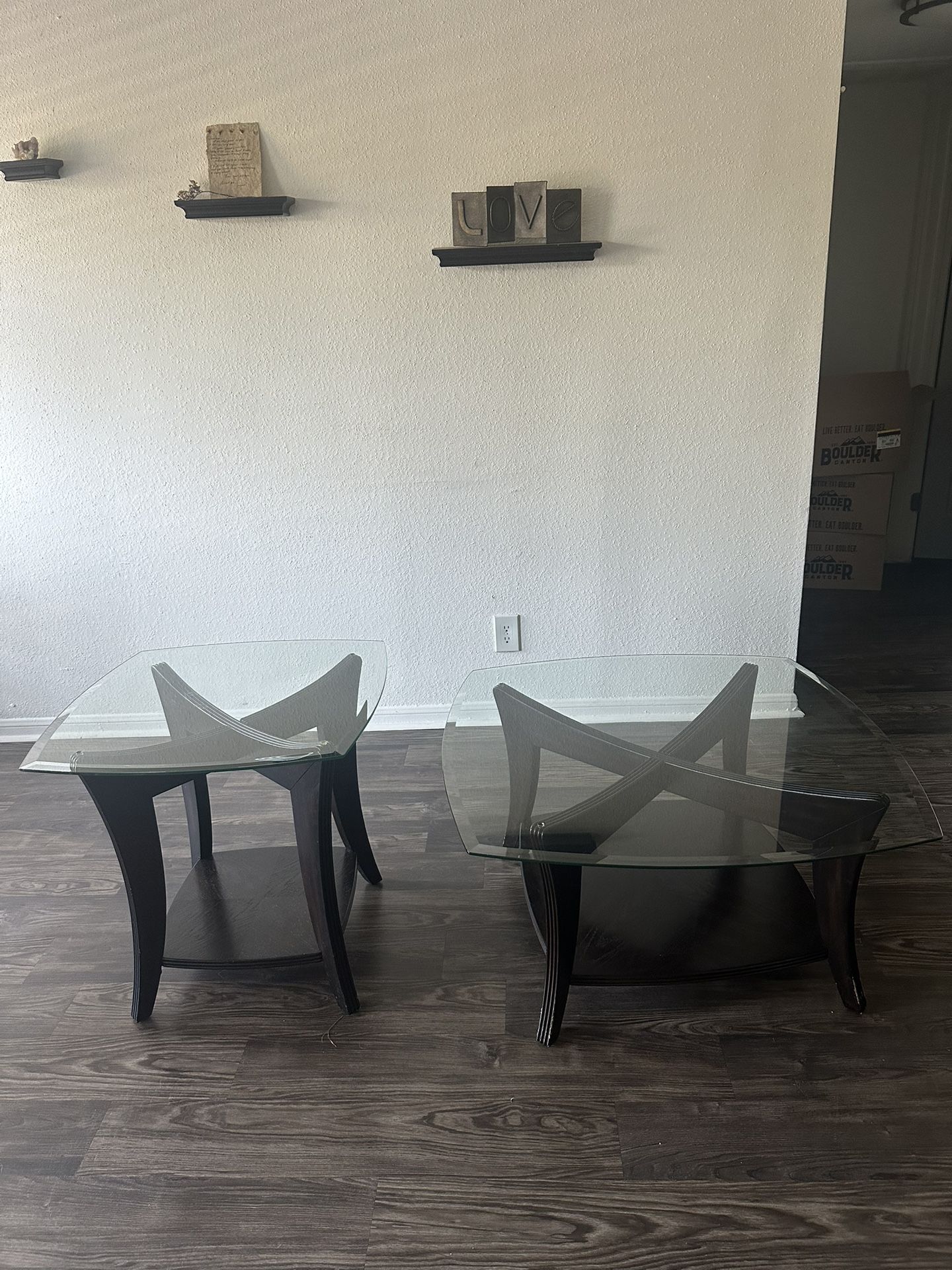 Can be sold together or separately. End table/coffee table, very good quality with ware and tear on the legs. Solid wood and glass top. $40 for the big one and $30 for the small or $50 for both.