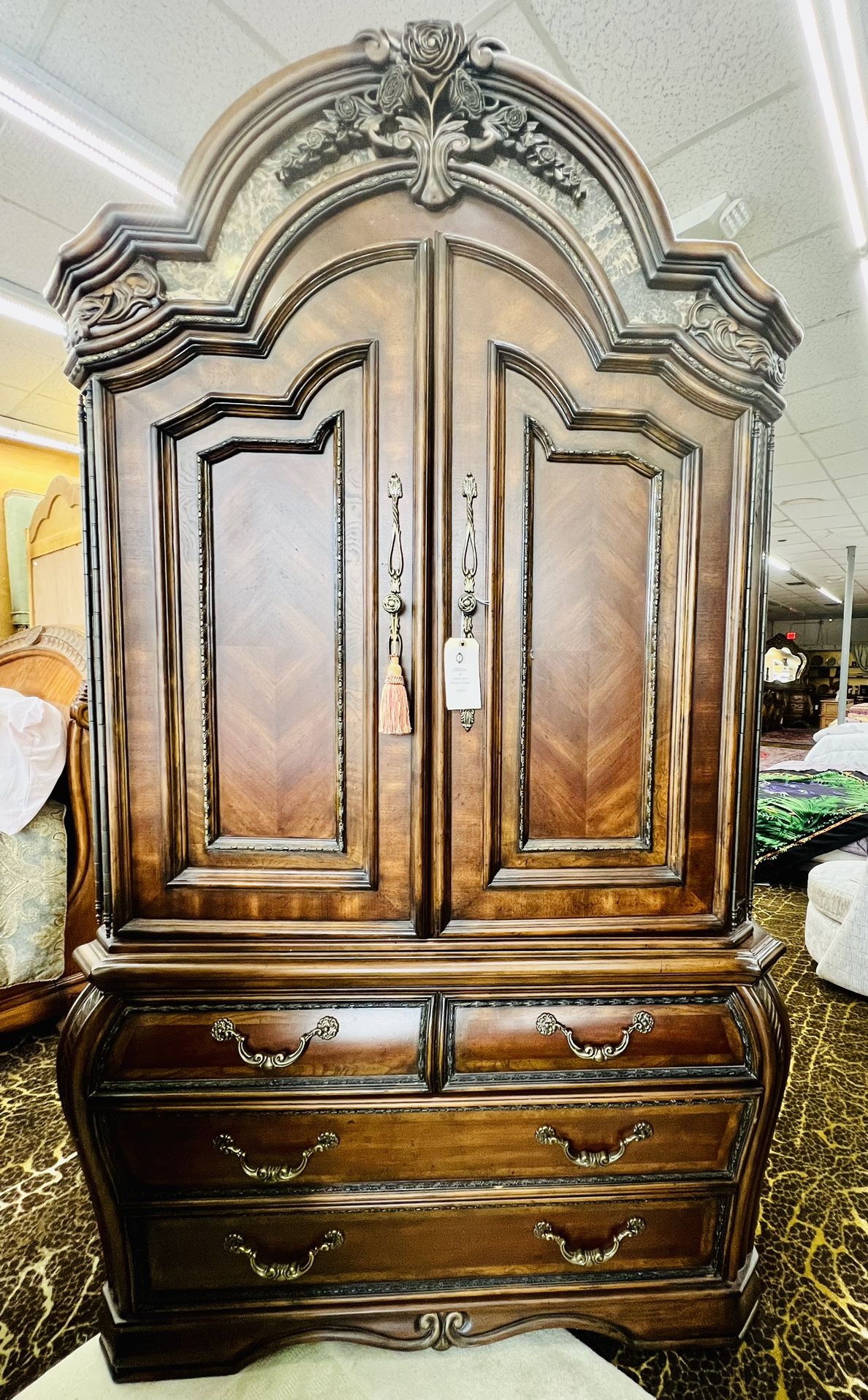 WE HAVE A LARGE INVENTORY IN HIGHEND FURNITURE, WOOD FURNITURE WITH ALL DIFFERENT COLLECTIONS. DINING ROOM SETS, BEDROOM SETS, LIVING ROOM SETS AND MANY OTHER BRANDS LIKE MAITLAND SMITH, VERSACE, BERNHARDT, HENREDON, BENNETTI AND ALSO ITEMS TO COMPLEMENT YOUR HOME DECOR, ACCESSORIES, PERFUM, JEWELRY, CHANDELIERS AND MORE. WE SHIP TO YOUR LOCATION!!! ASK FOR A VIDEO CALL WITH US!!! Oppulente is a gorgeous collection from the Michael Amini Signature Series. Oppulente was inspired by traditional Spanish, Italian and Moorish furniture designs and this classic collection is lovingly built by skilled artisans. The Oppulente Collection speaks to the fine quality that AICO furniture buyers world-wide have come to expect from Michael Amini. Crafted from select solid Birch hardwood with Mahogany, Ash Burl and Cherry veneers, the sweet Sienna Spice finish radiates a beauty and romance which is exclusive to this exquisite Oppulente collection. Dimensions: 52.0W x 59.0H x 24.0D AICO Furniture designed by Michael Amini has been a TOP name brand since 1988 AICO, which stands for Amini Innovation Corp, features original furniture designs and is known for high quality and intricately designed home furnishing case goods and upholstery. They offer many collections that suit various tastes and styles. Ask for our FINANCE LAYAWAY program!!! 🦊 Additional we have Available FINANCING with Klarna, PayPal, ACIMA And more!!! Available at: Snooty Fox Consignments 840 E Oakland Park Blvd Oakland Park, FL 33334 754.206.20.77
