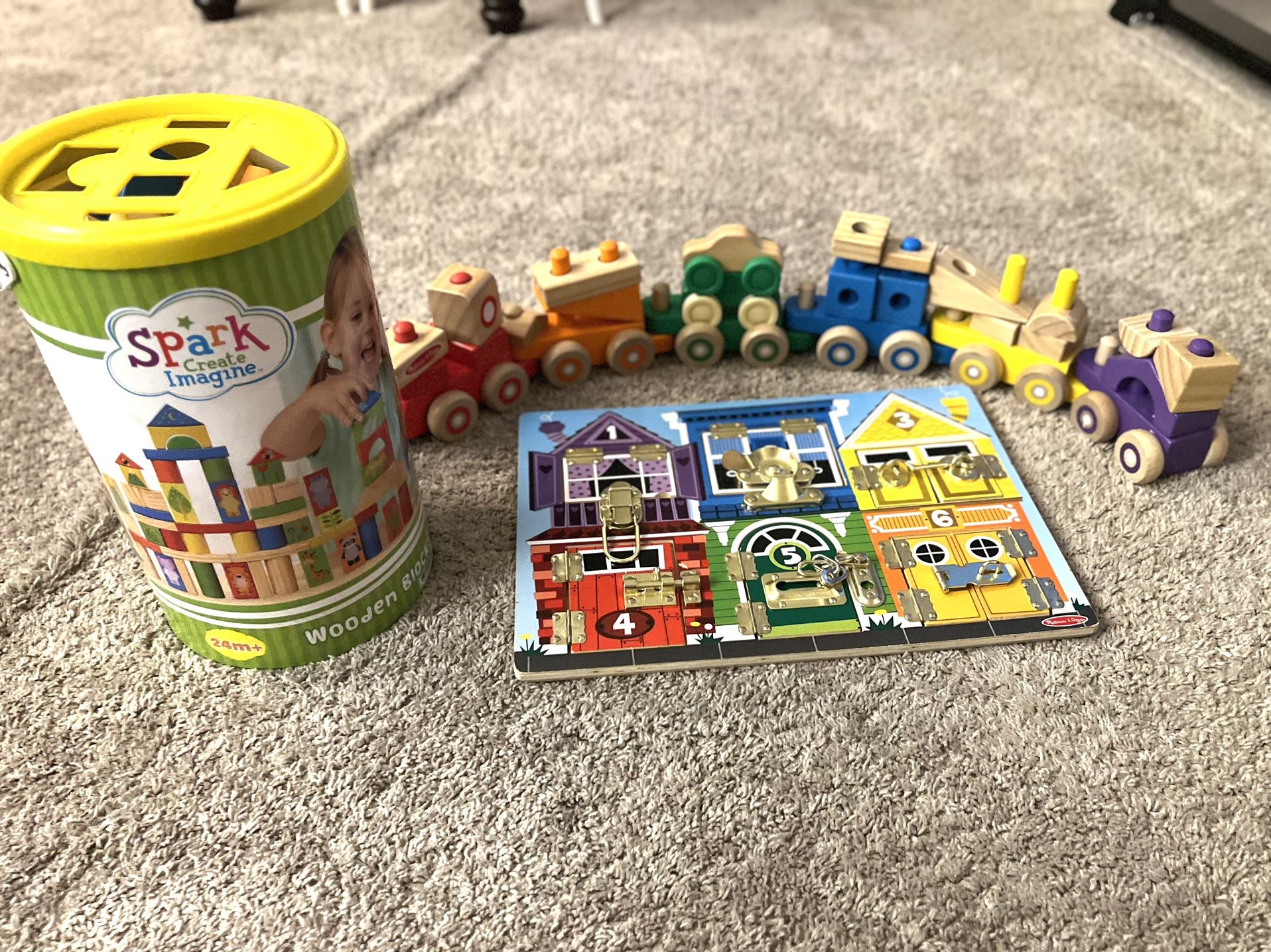 Selling a set of toys perfect for toddlers! Includes a Spark Create Imagine Wooden Blocks set with 152 pieces and a Melissa & Doug Latches Board. Both are in great condition and ready for a new home!
