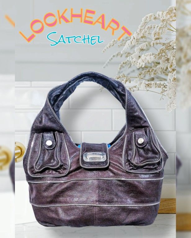 Here I have a beautiful Leather Satchel boho designer bag by "Lockheart". It definitely has a really awesome custom street edgy design to it. This is a very RARE bag by this company now as its difficult to find in this beautiful "Brown almost purple, more towards the dark brown" color depending on the lighting. This Lockhart Shoulder Bag, has a magnetic front clasp, zipper details throughout, two smaller front zipper design Magnetic pockets. Interior Bronze/gold striped material color with several pockets. Please see Pictures for Details on Wear throughout bag as there is a stain/smudge on inside bag & more wear throughout. Dimensions: are roughly about Drop 10" Height - 19.5" Width - 16" Depth - 6"