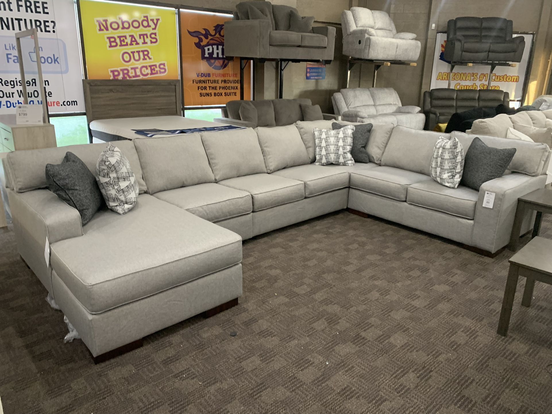 Brand new sectional. Beautiful gray fabric. Plush comfortable cushions. Nice square arms. Fade-resistant, stain-resistant and a breeze to clean. Delivery and payment plans available