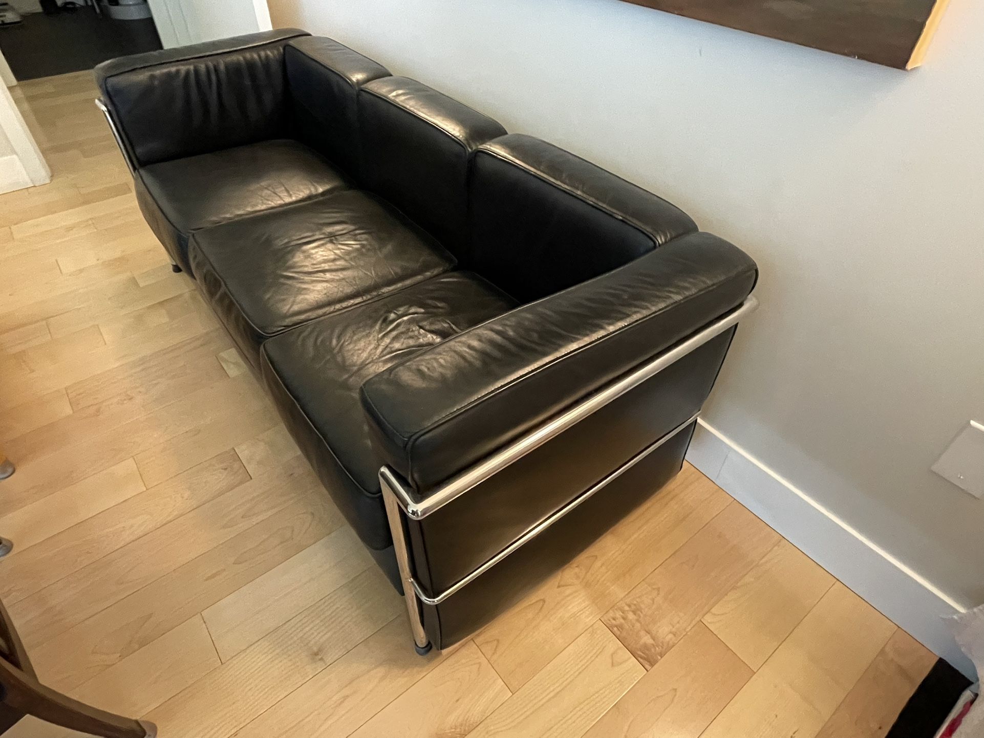 Leather Corbusier-style Sofa Couch! Black, genuine leather. Measurements as shown. Non-smoking home. Gorgeous black supple leather. Used but still has a lot of life left. Sturdy metal frame. Chrome for stylish and sleek look. I live downtown and have a loading area for easy pick up. Cash only. Exact cash only, no change will be given. Let me know if you have any questions! Thanks for looking.