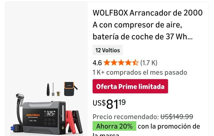 WOLFBOX Arrancador de 2000 A con compresor de aire, batería de coche de 37 Wh portátil (hasta motor de gasolina de 5 L) con inflador de neumáticos de 150 PSI, caja de salto de 12 V con cables
