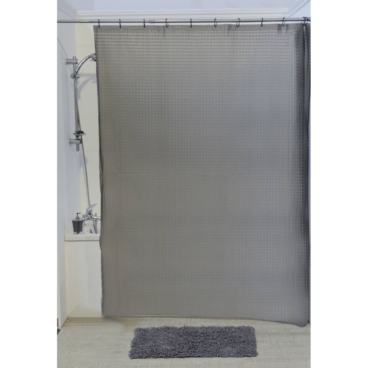 This 3D laser shower curtain is made of Eva Plastic (100% laser) and allows to bring in useful light inside the shower or bathtub. It features a nice reflecting effect with its checkered pattern. Reinforced grommets and header along the top make it durable enough for long-lasting satisfaction (12 shower rings needed, sold separately). It will fit perfectly in your shower or bathtub. Prior to hanging, immerse curtain in a bath of warm water to help remove creases. Cleaning with soapy water only. Width 71-Inch and height 79-Inch (180 x 200cm). Color gray. Imported from France, made in PRC. This shower curtain is perfect to add a modern touch in your bathroom!