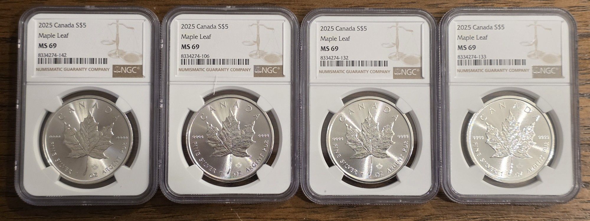 Four 2025 Silver Maple Leaf .9999 Fine Silver Rounds