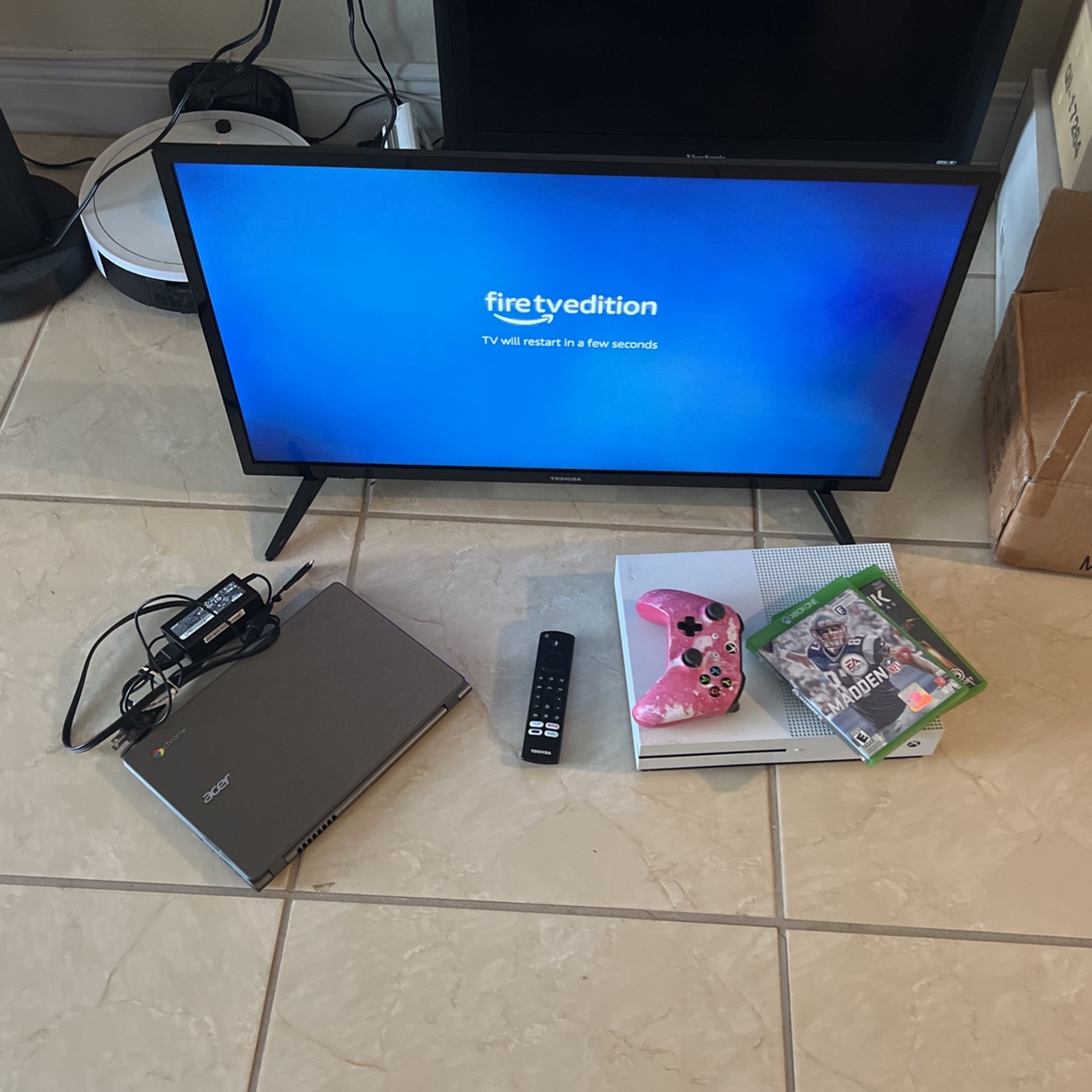 Acer chrome book with power cord Xbox One S, console, wireless controller, cables and 2 free games!! 32” Toshiba Smart Flat Panel with remote control